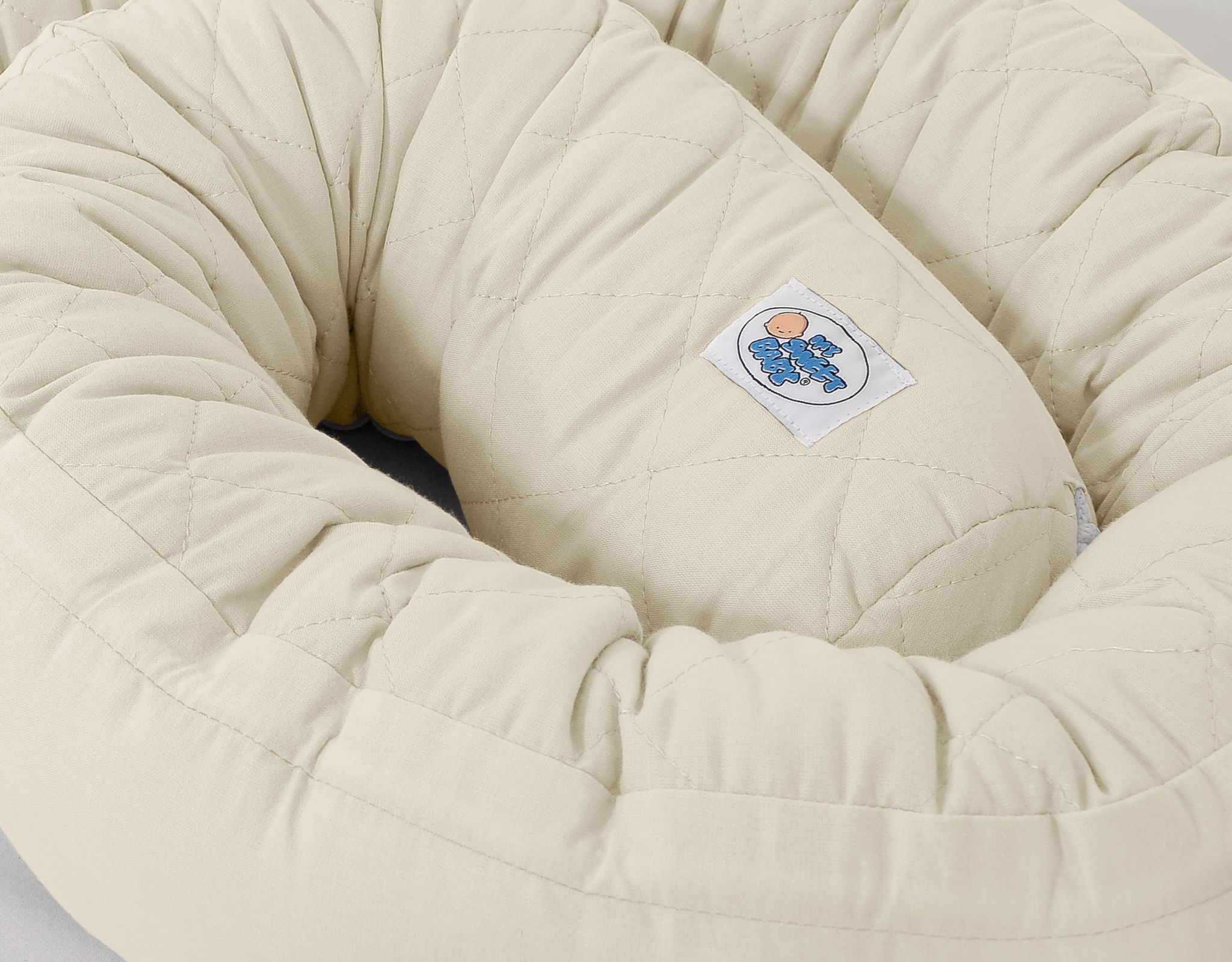 The cocoon has a removable roller with a length of 220cm and a diameter of about 12cm, which can later be used as a cot bumper. The material of which the roller is sewn is quilted fabric made of 100% cotton. The filling is a special certified fibre – a soft and breathable ECO FILLBALL. They are thin soft fibers formed into small balls with additional ventilation channels.