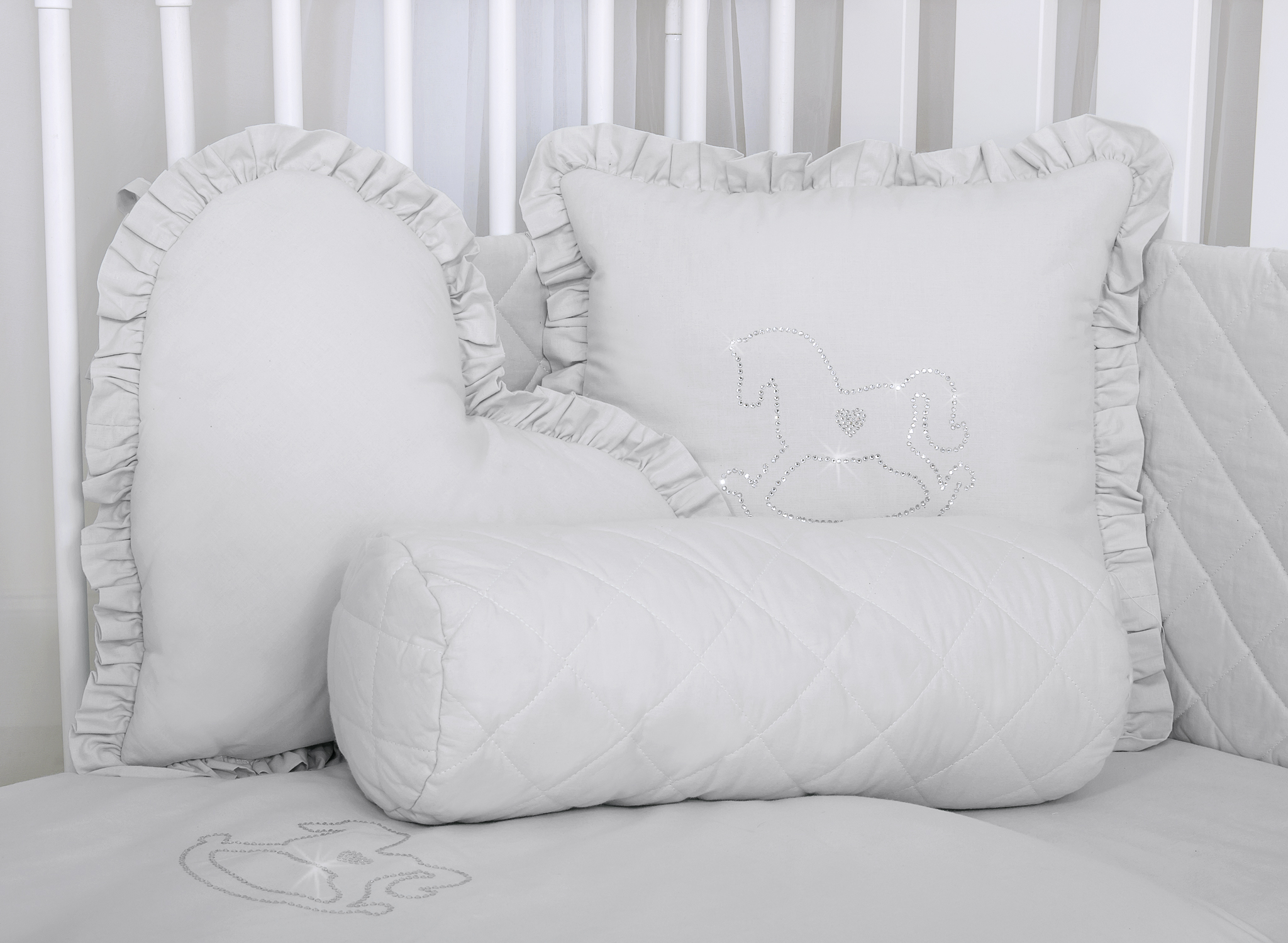 Elegant heart-shaped pillow. Decorated with a frill. Outer fabric made of 100% cotton (not demountable). The filling inside the pillow it is Eco Fillball- atested Silicone Balls – “artificial fluff” for pillows- filling ensures proper settlement of the baby and air circulation. It will work excellent as a decoration of the children’s room. The heart is a whole- without a removable pillowcase. It is a beautiful set with our beddings.