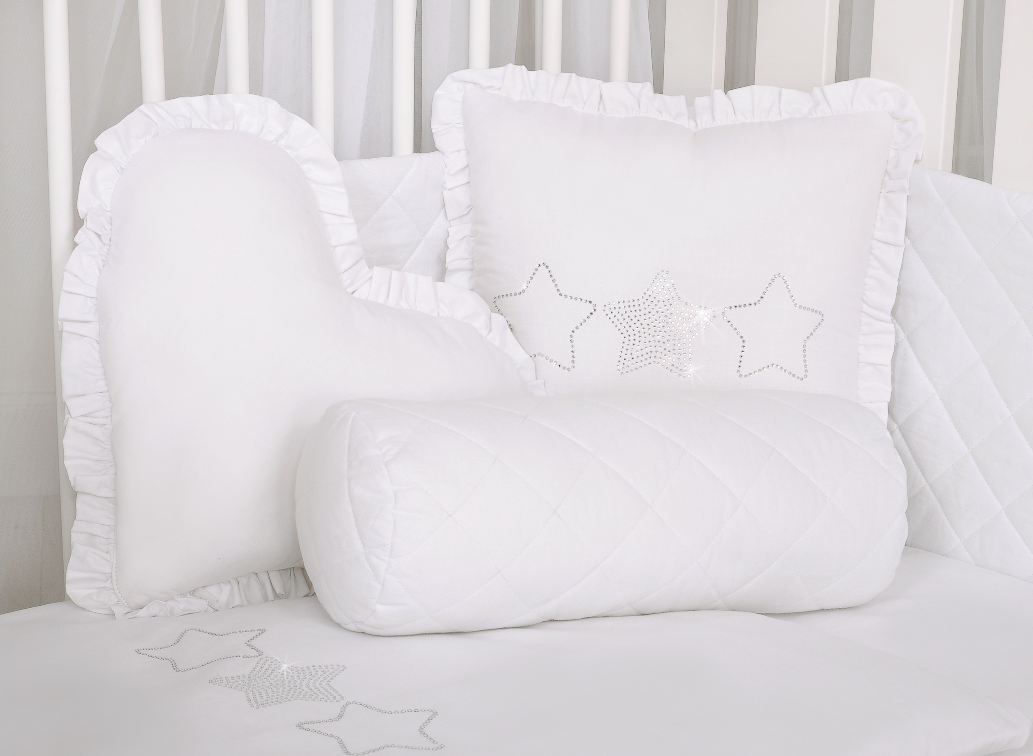 Elegant heart-shaped pillow. Decorated with a frill. Outer fabric made of 100% cotton (not demountable). The filling inside the pillow it is Eco Fillball- atested Silicone Balls – “artificial fluff” for pillows- filling ensures proper settlement of the baby and air circulation. It will work excellent as a decoration of the children’s room. The heart is a whole- without a removable pillowcase. It is a beautiful set with our beddings.