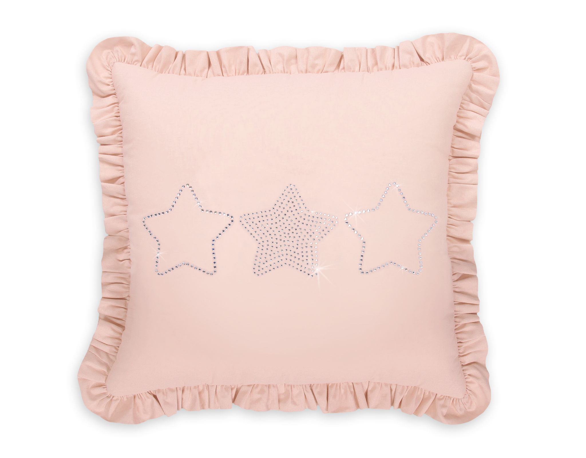Elegant pillow with application. Decorated with a frill. The pillowcase catches the eye with a shimmering application made of fine zircons on smooth cotton fabric. Outer fabric made of 100% cotton (not demountable). The filling inside the pillow it is Eco Fillball- atested Silicone Balls – “artificial fluff” for pillows- filling ensures proper settlement of the baby and air circulation. It will work excellent as a decoration of the children’s room. The pillow is a whole- without a removable pillowcase. It is a beautiful set with our beddings.