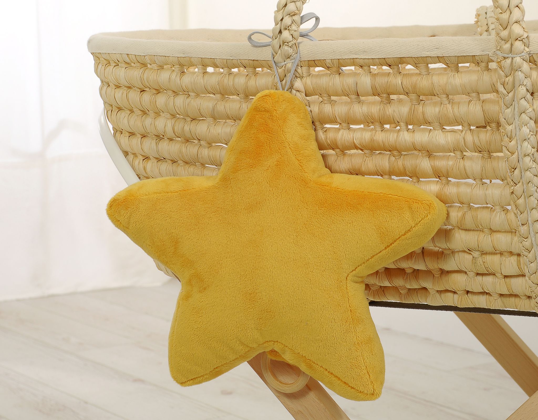 Music box for babies – a soft star. A beautiful music box with a delicate melody will make it easier for the baby to fall asleep, it will also be a beautiful decoration for a child’s room. Made of soft, smooth Minky. The filling is antiallergic fibers – silicone balls without optical brighteners. The mechanism of the music box is attached to a beech wooden ring.
