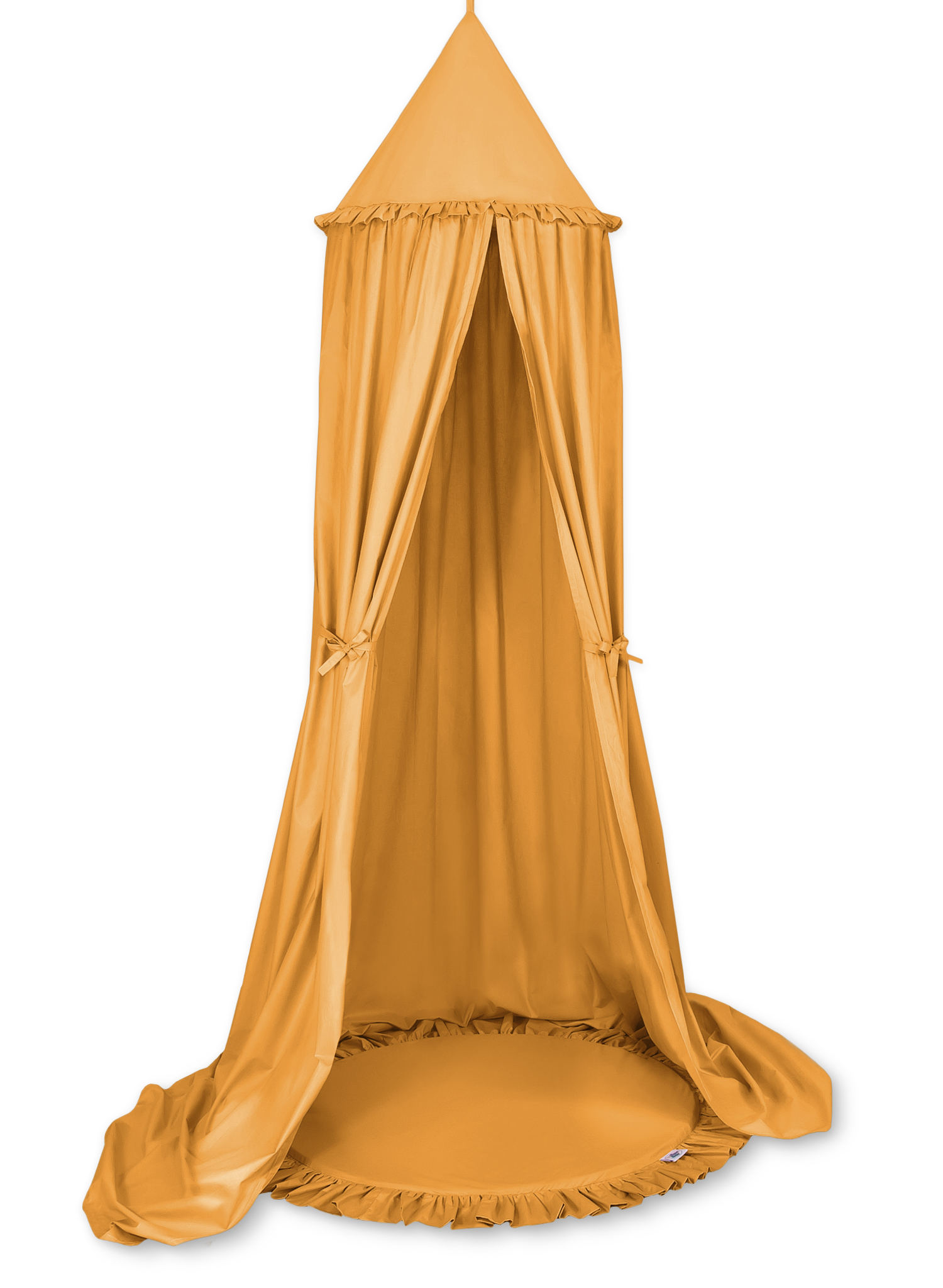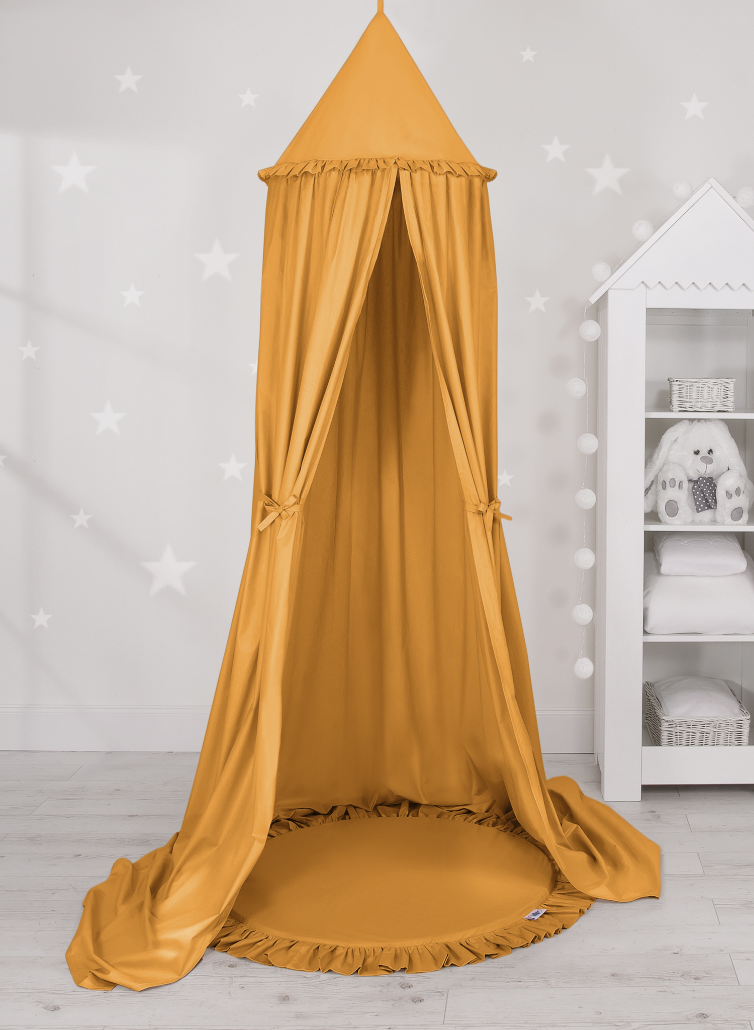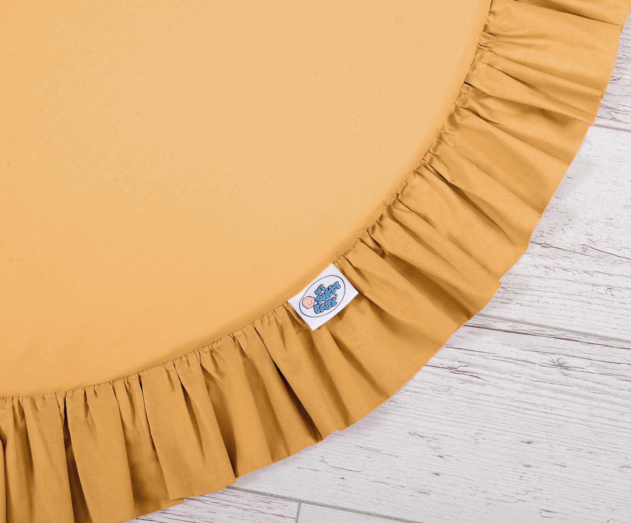 A floor play mat with ruffle. It can be used as a carpet,  play mat, or as a floor mat for the long canopy. From the first days of life can it be used as a place to rest or as a tummy time play mat. It has a soft filling that perfectly isolates from the hard and cold floor. The cover is made of OKOTEX certified 100% cotton.  The bottom of the play mat is made of a modern, anti-allergic, attested material. The bottom can be removed and the cover can be washed.
