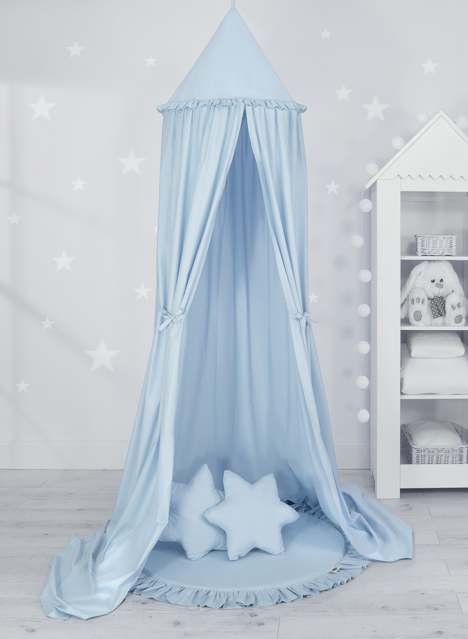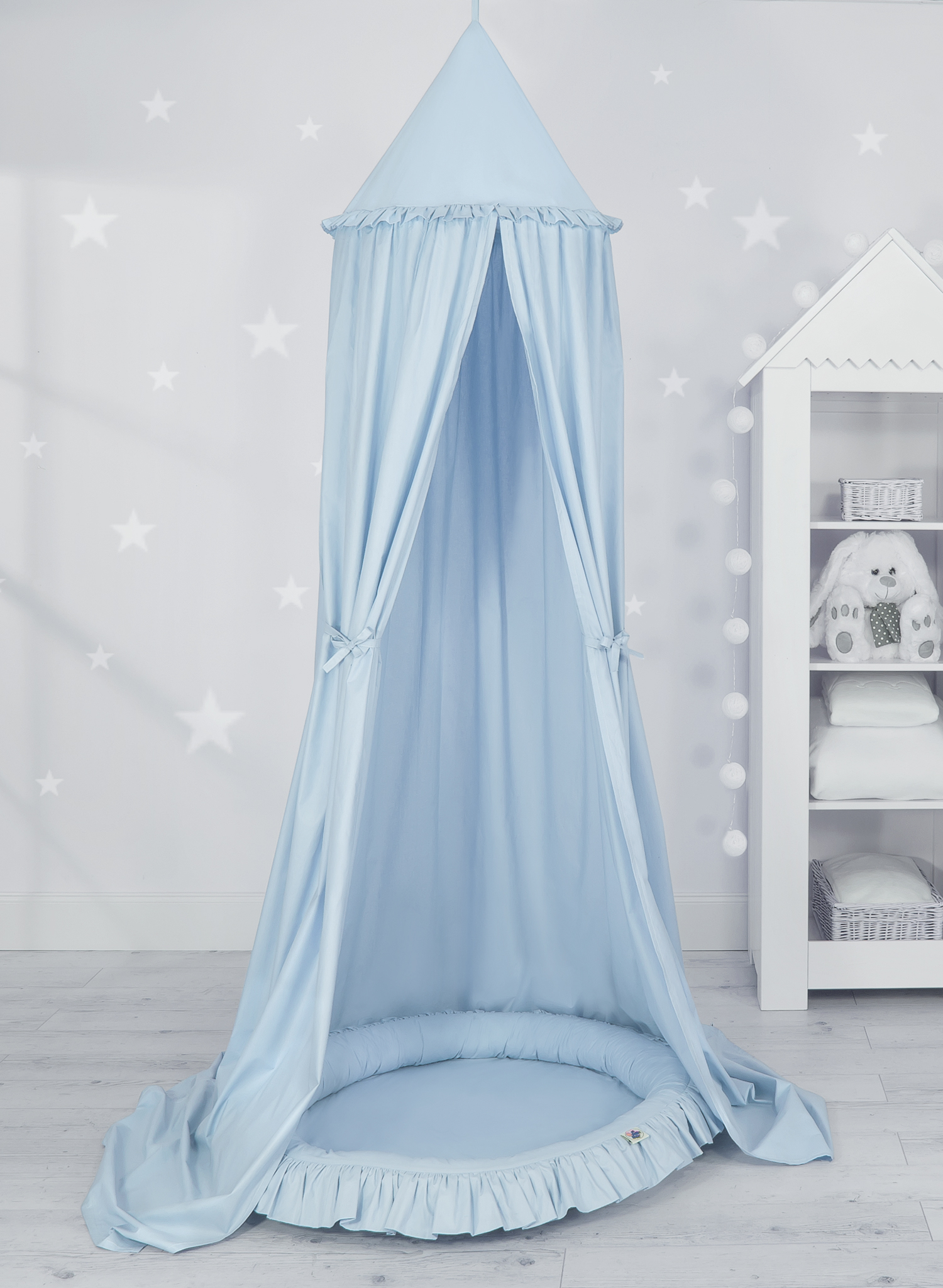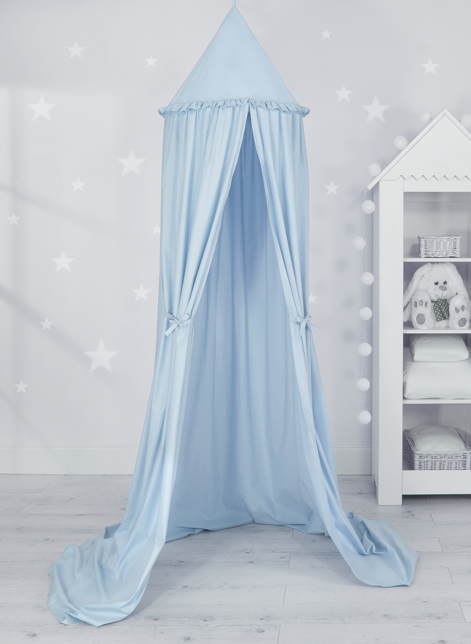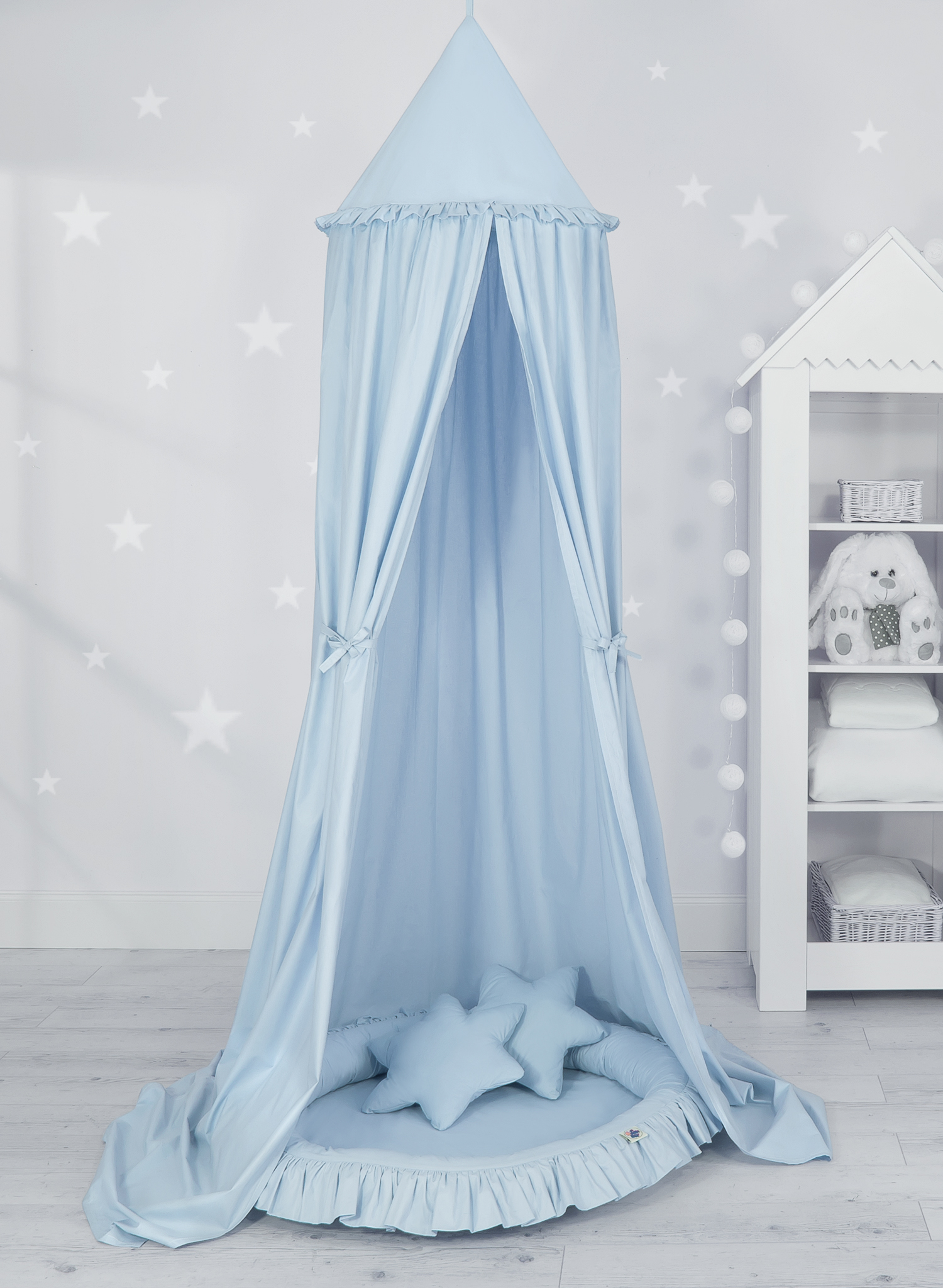 An effective long hanging canopy. A beautiful element it the children’s room. It can be used as a unique decoration of a baby cot, as well as it can create a wonderful  place to play. Hanging over the cot protect the canopy against too much light and noise creating a cozy  and safe place to rest inside the cot. The canopy can be easily mounted to the ceiling. The length of 260 cm allows to arrange the ends on the floor. This creates a perfect hiding place and playground for older children. The canopy is made of Okotex certificated, 100% cotton fabric. On the sides there are practical ribbons for tying the canopy and create a beautiful tent. The rim on the top can be removed. The fabric is washable by 30 Degrees.