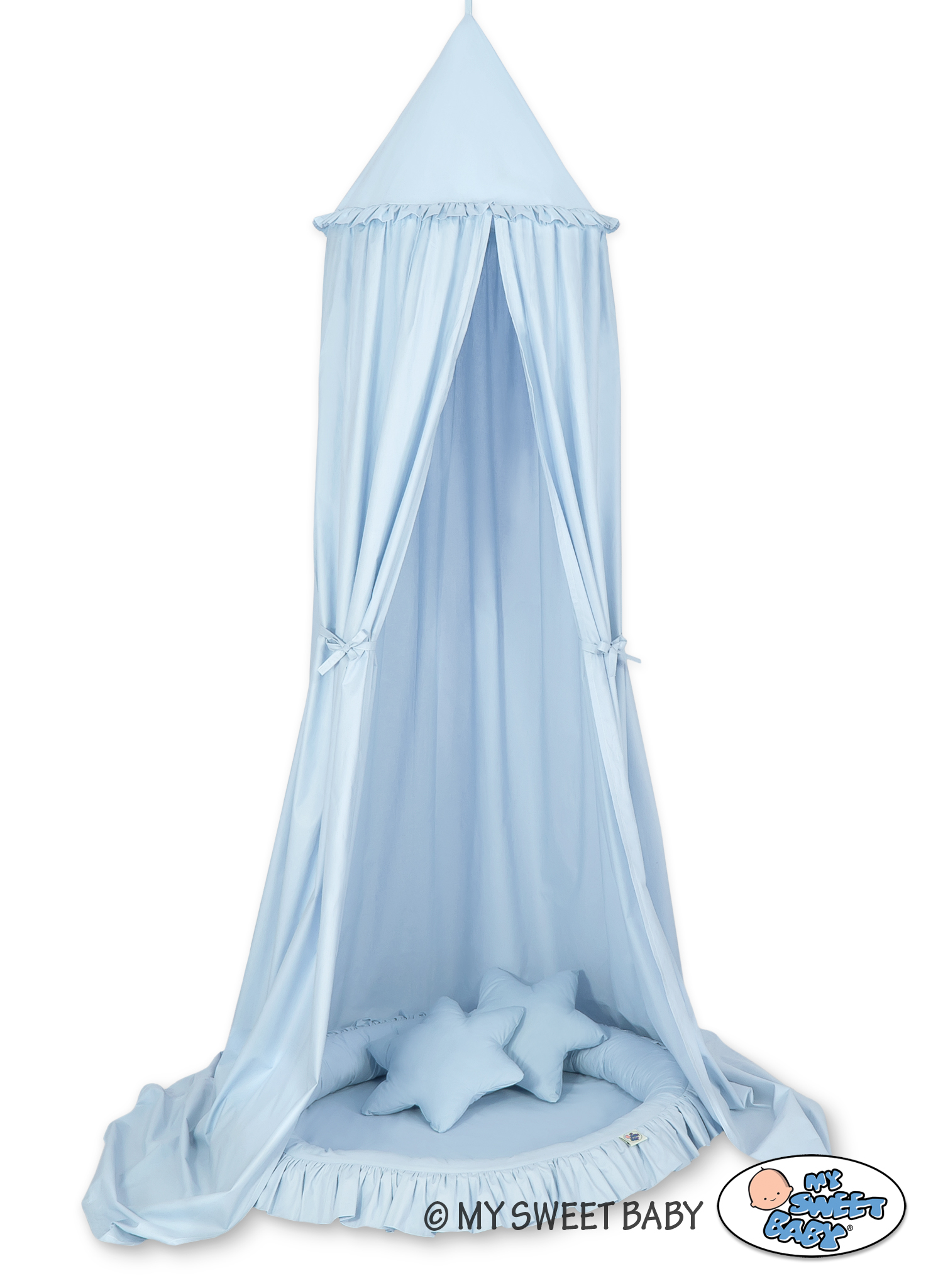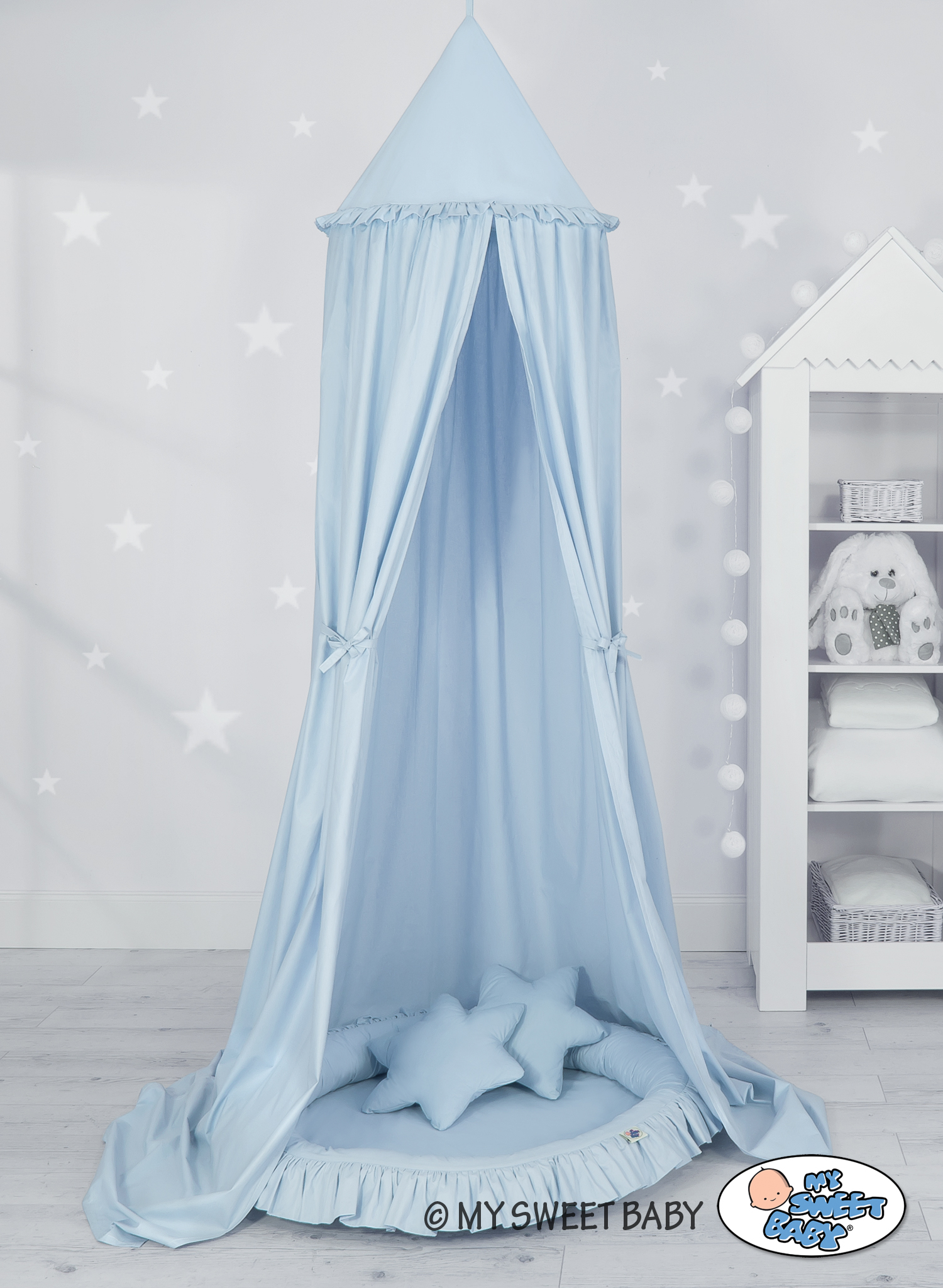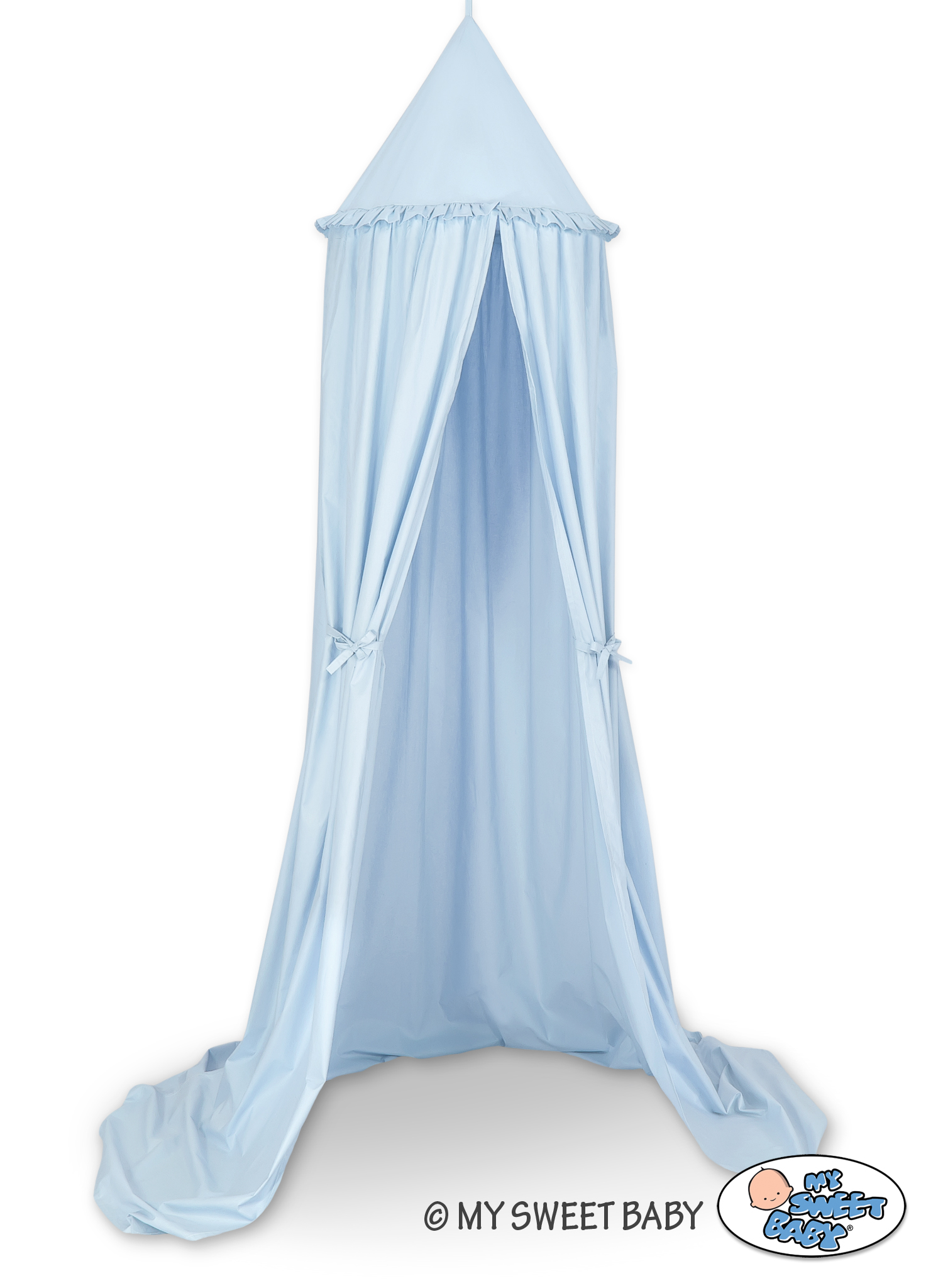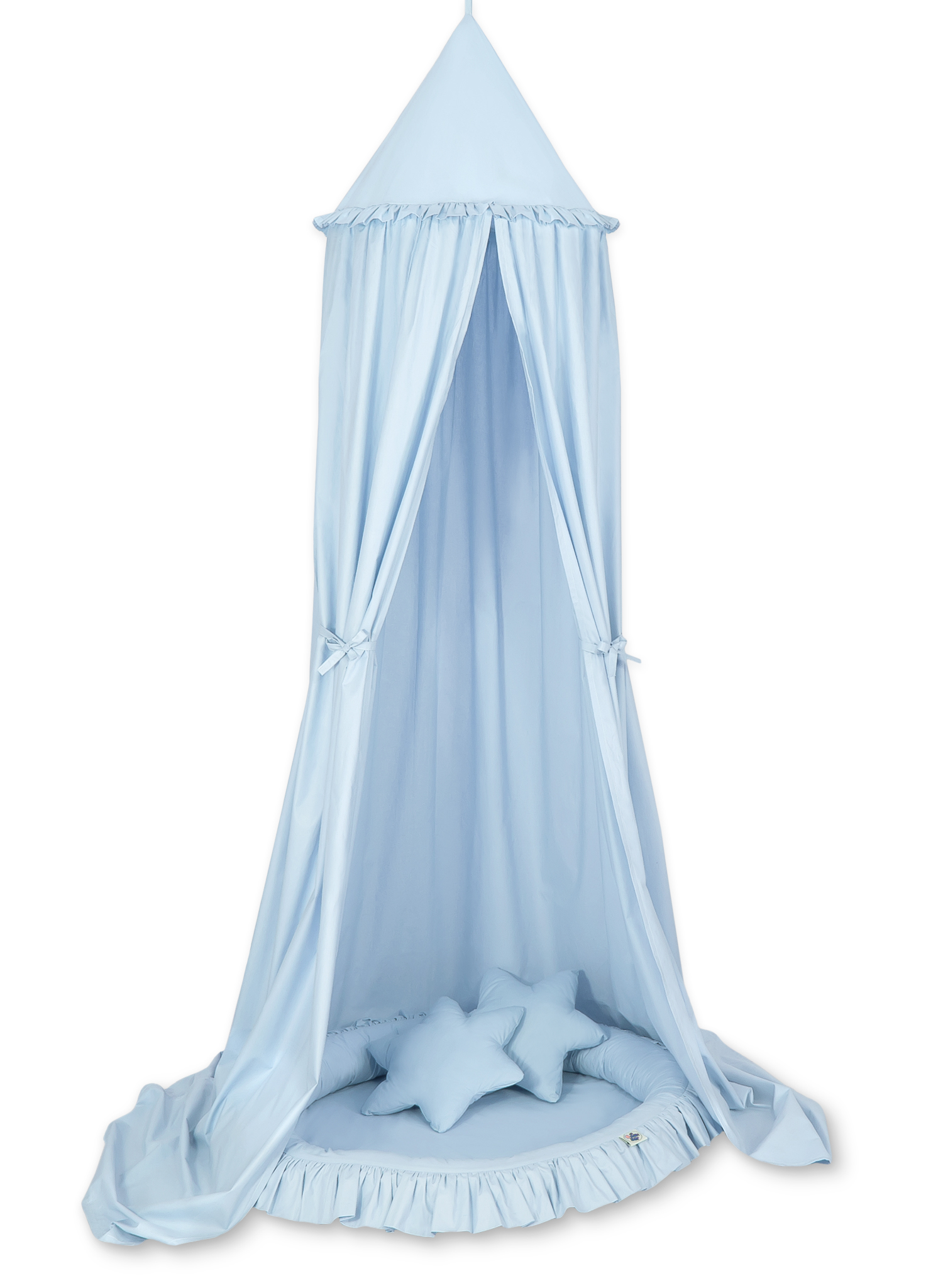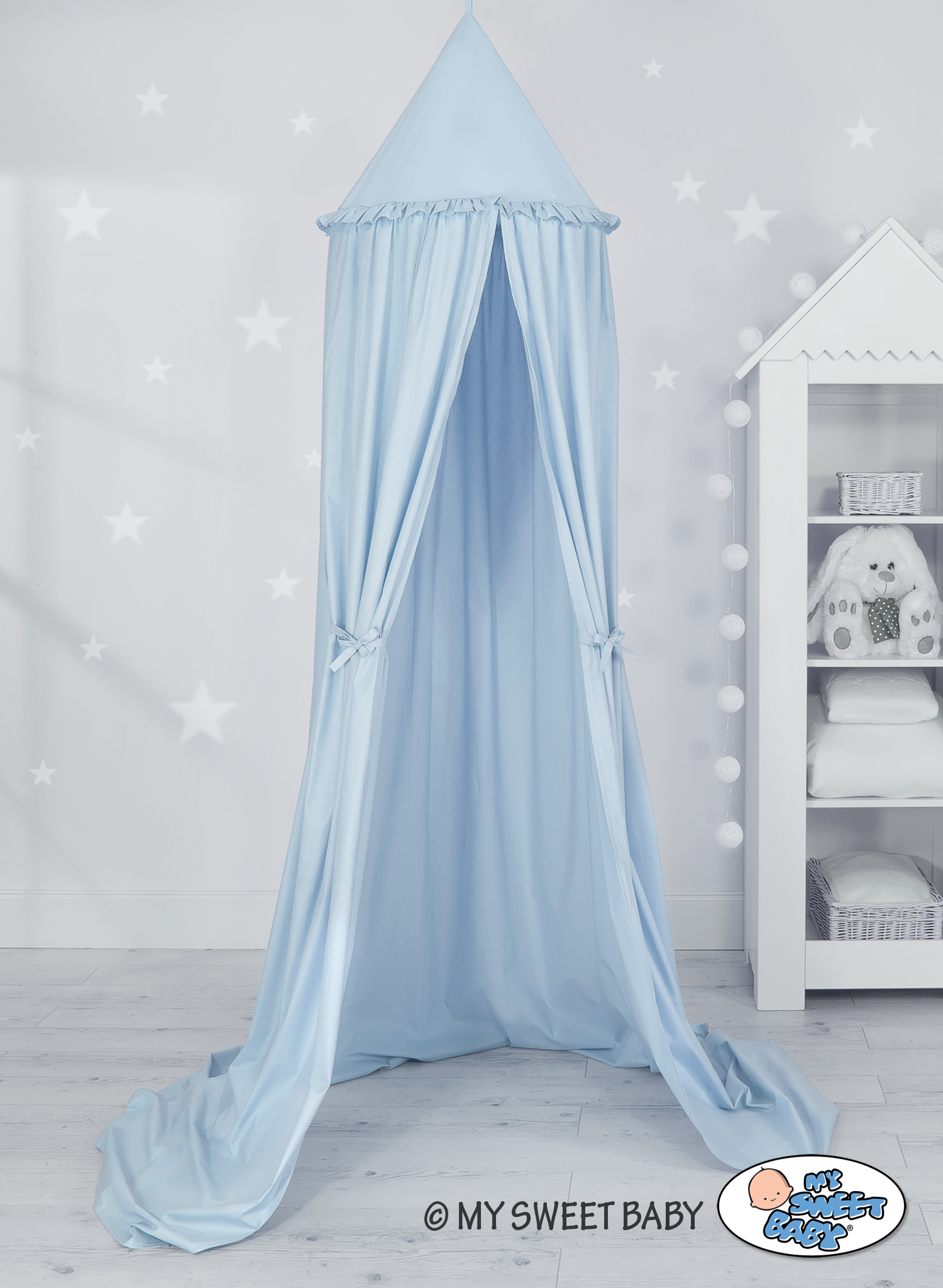 An effective long hanging canopy. A beautiful element it the children’s room. It can be used as a unique decoration of a baby cot, as well as it can create a wonderful  place to play. Hanging over the cot protect the canopy against too much light and noise creating a cozy  and safe place to rest inside the cot. The canopy can be easily mounted to the ceiling. The length of 260 cm allows to arrange the ends on the floor. This creates a perfect hiding place and playground for older children. The canopy is made of Okotex certificated, 100% cotton fabric. On the sides there are practical ribbons for tying the canopy and create a beautiful tent. The rim on the top can be removed. The fabric is washable by 30 Degrees.