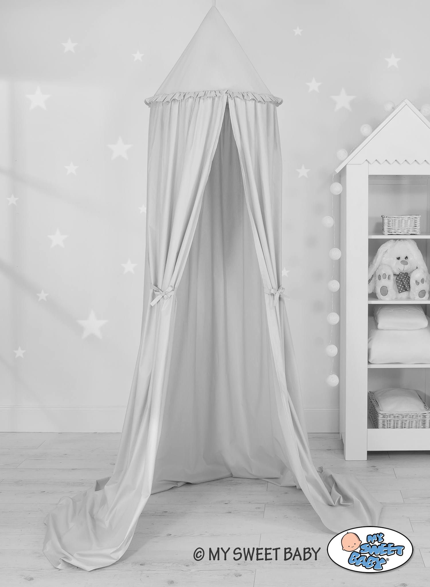 An effective long hanging canopy. A beautiful element it the children’s room. It can be used as a unique decoration of a baby cot, as well as it can create a wonderful  place to play. Hanging over the cot protect the canopy against too much light and noise creating a cozy  and safe place to rest inside the cot. The canopy can be easily mounted to the ceiling. The length of 260 cm allows to arrange the ends on the floor. This creates a perfect hiding place and playground for older children. The canopy is made of Okotex certificated, 100% cotton fabric. On the sides there are practical ribbons for tying the canopy and create a beautiful tent. The rim on the top can be removed. The fabric is washable by 30 Degrees.