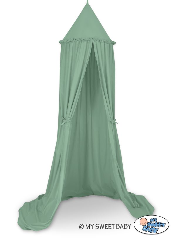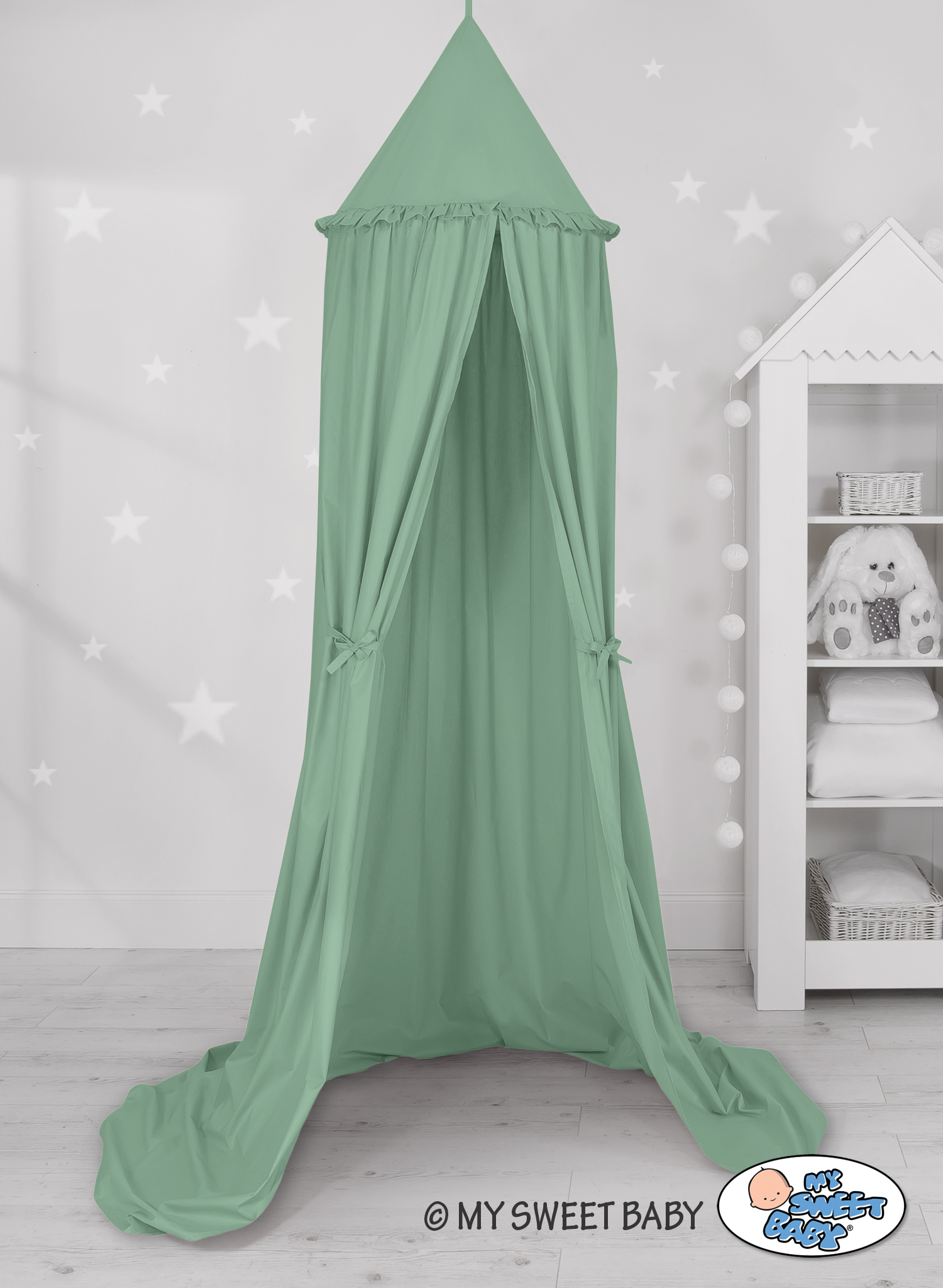 An effective long hanging canopy. A beautiful element it the children’s room. It can be used as a unique decoration of a baby cot, as well as it can create a wonderful  place to play. Hanging over the cot protect the canopy against too much light and noise creating a cozy  and safe place to rest inside the cot. The canopy can be easily mounted to the ceiling. The length of 260 cm allows to arrange the ends on the floor. This creates a perfect hiding place and playground for older children. The canopy is made of Okotex certificated, 100% cotton fabric. On the sides there are practical ribbons for tying the canopy and create a beautiful tent. The rim on the top can be removed. The fabric is washable by 30 Degrees.
