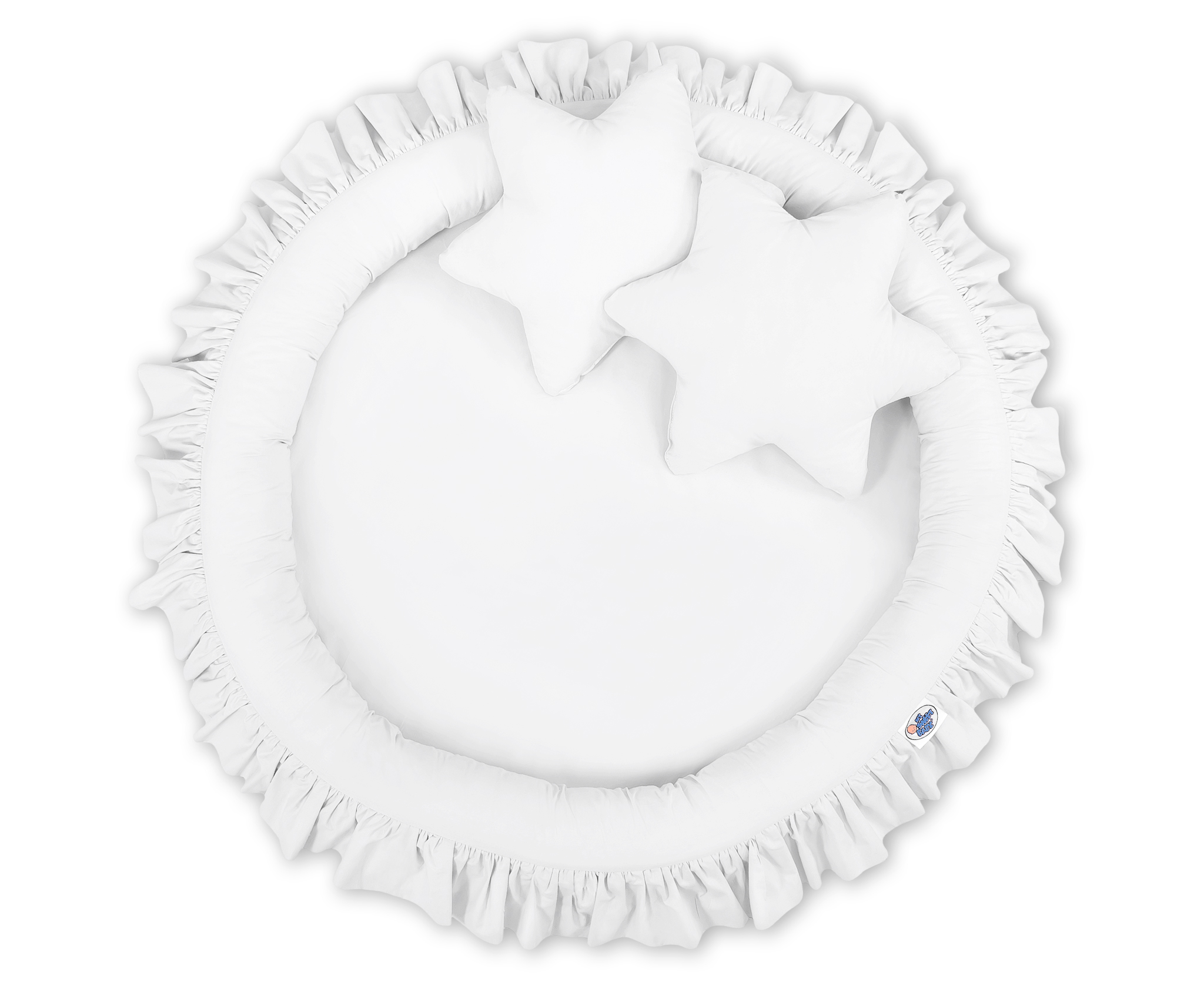 Lovely nest with a flounce. A functional and practical nest to play. The nest is ideal as a place to play, or as a floor nest for the long sky. The nest with a flounce can be used since the first days of life as a safe place to rest. The soft edges provide safety for the babies. It is perfect as a playground where many toys find their place. Combined with the long sky, creates the flounce nest a beautiful play tent.