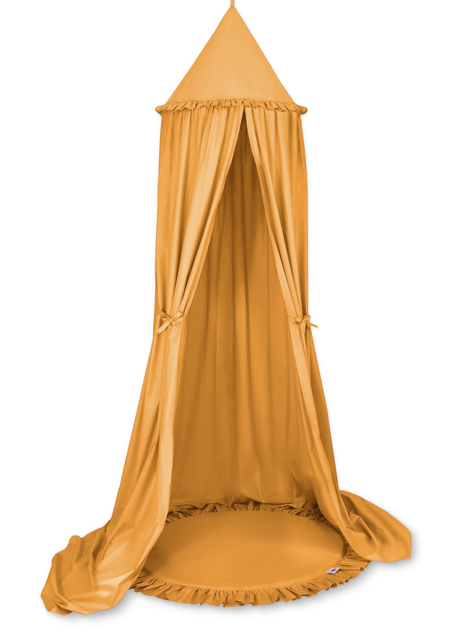 An effective long hanging canopy. A beautiful element it the children’s room. It can be used as a unique decoration of a baby cot, as well as it can create a wonderful  place to play. Hanging over the cot protect the canopy against too much light and noise creating a cozy  and safe place to rest inside the cot. The canopy can be easily mounted to the ceiling. The length of 260 cm allows to arrange the ends on the floor. This creates a perfect hiding place and playground for older children. The canopy is made of Okotex certificated, 100% cotton fabric. On the sides there are practical ribbons for tying the canopy and create a beautiful tent. The rim on the top can be removed. The fabric is washable by 30 Degrees. Combined with soft and comfy floor mat it will become a perfect place for fun. The mat has a soft filling that perfectly isolates from the hard and cold floor. The cover is made of OKOTEX certified 100% cotton.  The bottom of the play mat is made of a modern, anti-allergic, attested material. The bottom can be removed and the cover can be washed.
