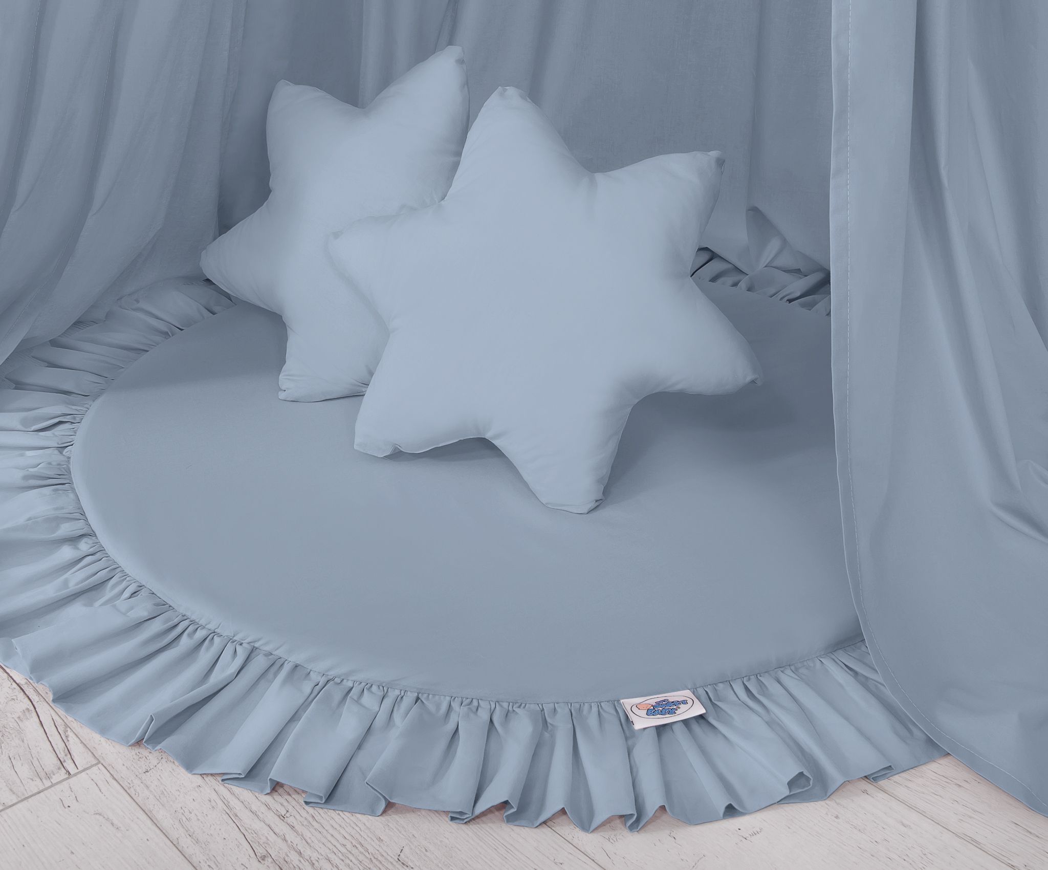 An effective long hanging canopy. A beautiful element it the children’s room. It can be used as a unique decoration of a baby cot, as well as it can create a wonderful  place to play. Hanging over the cot protect the canopy against too much light and noise creating a cozy  and safe place to rest inside the cot. The canopy can be easily mounted to the ceiling. The length of 260 cm allows to arrange the ends on the floor. This creates a perfect hiding place and playground for older children. The canopy is made of Okotex certificated, 100% cotton fabric. On the sides there are practical ribbons for tying the canopy and create a beautiful tent. The rim on the top can be removed. The fabric is washable by 30 Degrees. Combined with soft and comfy floor mat it will become a perfect place for fun. The mat has a soft filling that perfectly isolates from the hard and cold floor. The cover is made of OKOTEX certified 100% cotton.  The bottom of the play mat is made of a modern, anti-allergic, attested material. The bottom can be removed and the cover can be washed.
