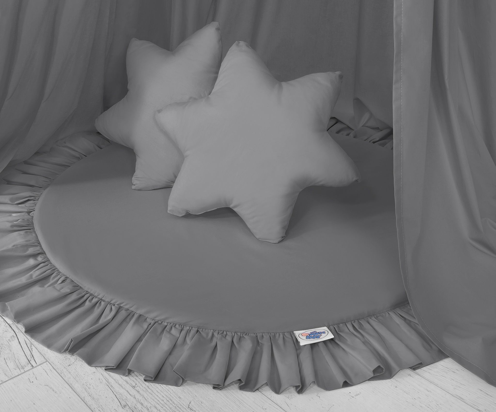 An effective long hanging canopy. A beautiful element it the children’s room. It can be used as a unique decoration of a baby cot, as well as it can create a wonderful  place to play. Hanging over the cot protect the canopy against too much light and noise creating a cozy  and safe place to rest inside the cot. The canopy can be easily mounted to the ceiling. The length of 260 cm allows to arrange the ends on the floor. This creates a perfect hiding place and playground for older children. The canopy is made of Okotex certificated, 100% cotton fabric. On the sides there are practical ribbons for tying the canopy and create a beautiful tent. The rim on the top can be removed. The fabric is washable by 30 Degrees. Combined with soft and comfy floor mat it will become a perfect place for fun. The mat has a soft filling that perfectly isolates from the hard and cold floor. The cover is made of OKOTEX certified 100% cotton.  The bottom of the play mat is made of a modern, anti-allergic, attested material. The bottom can be removed and the cover can be washed.