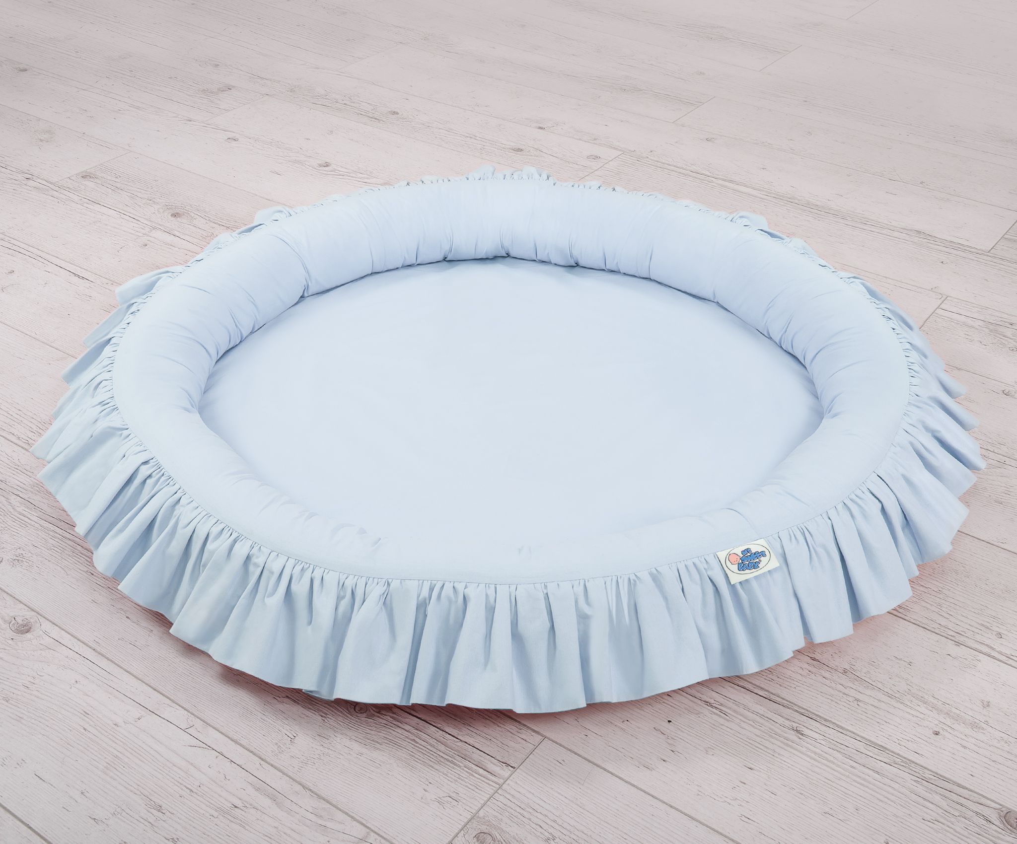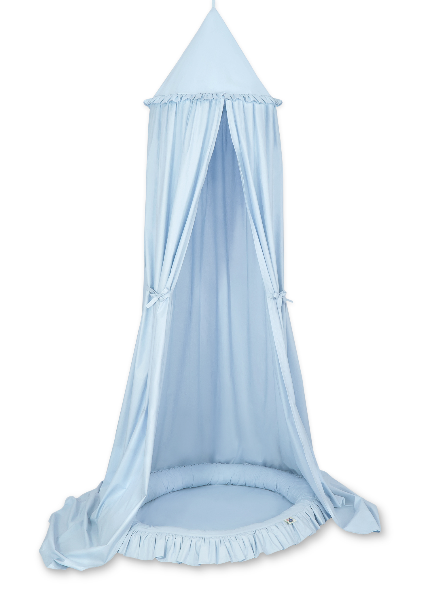 An effective long hanging canopy. A beautiful element it the children’s room. It can be used as a unique decoration of a baby cot, as well as it can create a wonderful  place to play. Hanging over the cot protect the canopy against too much light and noise creating a cozy  and safe place to rest inside the cot. The canopy can be easily mounted to the ceiling. The length of 260 cm allows to arrange the ends on the floor. This creates a perfect hiding place and playground for older children. The canopy is made of Okotex certificated, 100% cotton fabric. On the sides there are practical ribbons for tying the canopy and create a beautiful tent. The rim on the top can be removed. The fabric is washable by 30 Degrees. Combined with lovely nest with a flounce it will become a perfect place for fun. The soft edges provide safety for the babies. The edge is filled with approved, non-allergenic filling: Eco –Fillball fibers. They are soft, resilience and they assure the proper air circulation. The bottom of the baby nest with flounce is made of a modern, anti-allergenic, attested material. The bottom inlay can be removed and the cover can be washed at 30 degrees