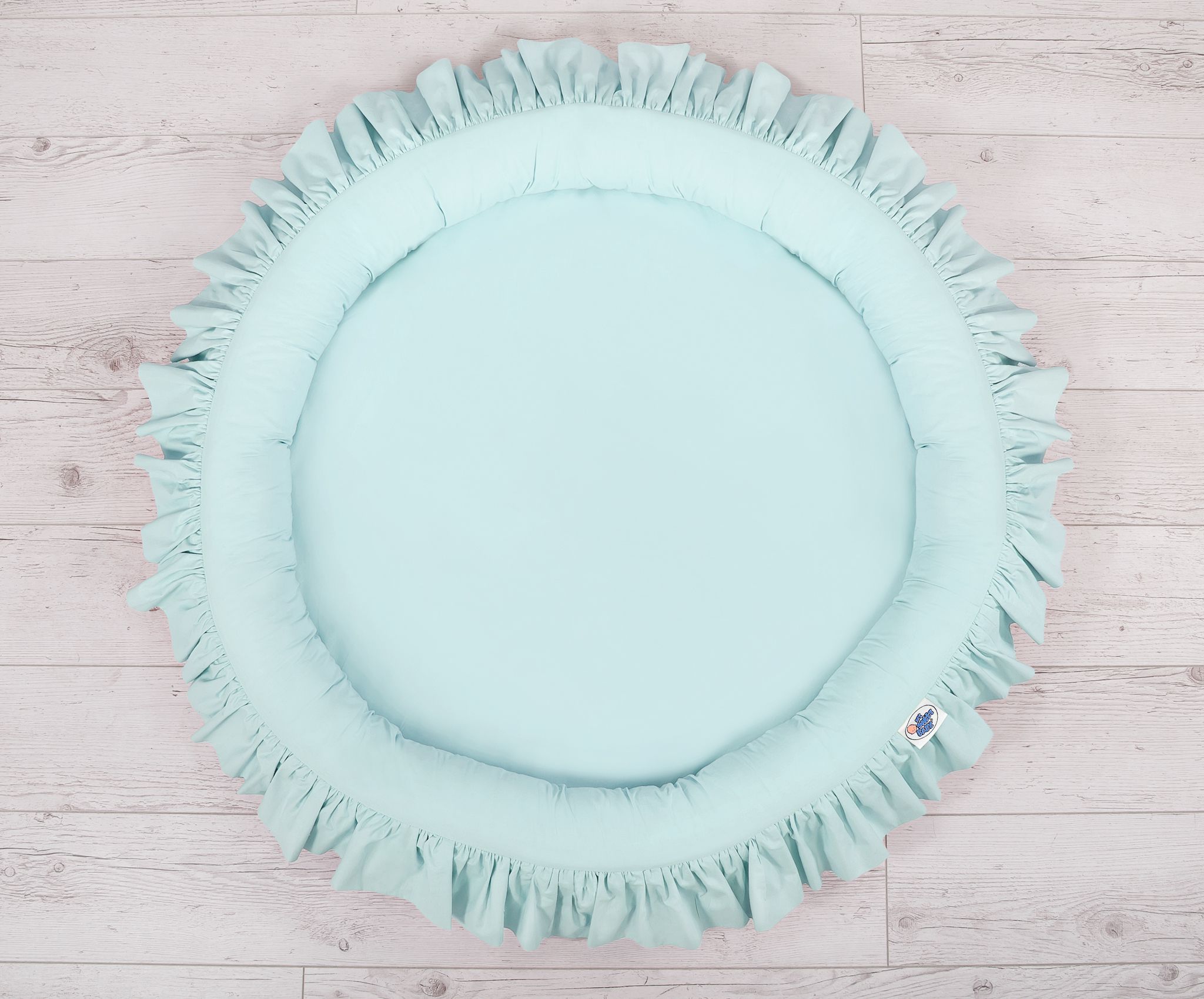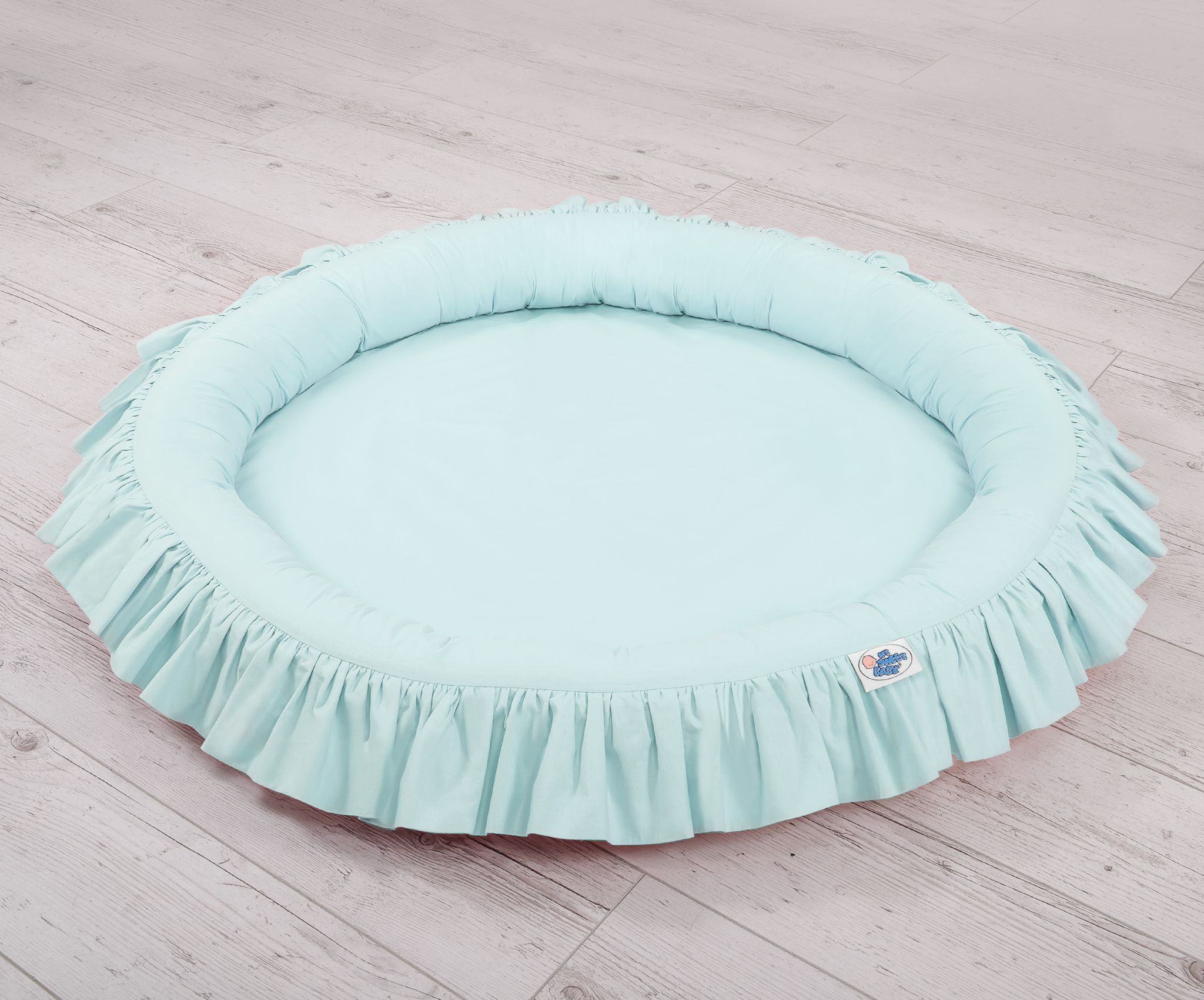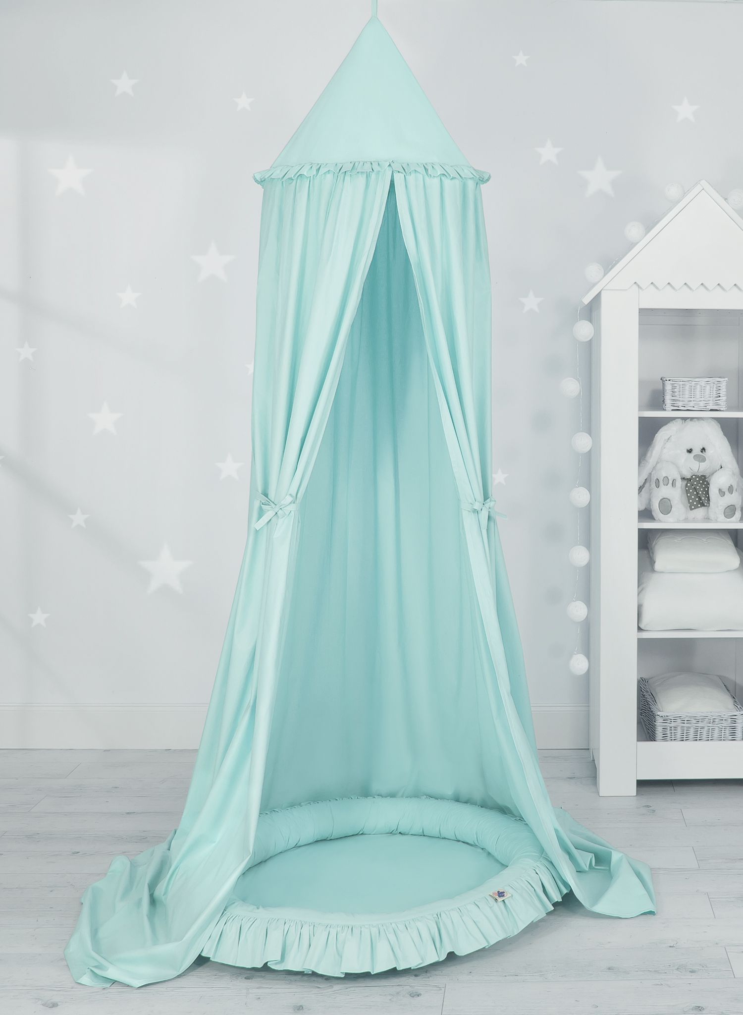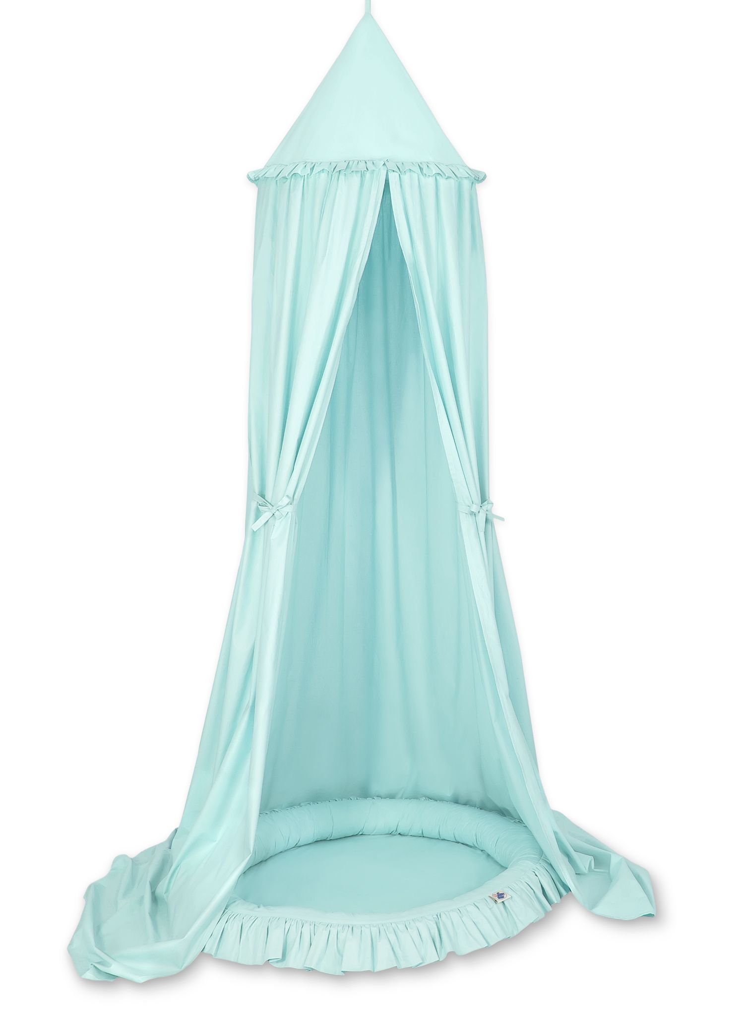 An effective long hanging canopy. A beautiful element it the children’s room. It can be used as a unique decoration of a baby cot, as well as it can create a wonderful place to play. Hanging over the cot protect the canopy against too much light and noise creating a cozy and safe place to rest inside the cot. The canopy can be easily mounted to the ceiling. The length of 260 cm allows to arrange the ends on the floor. This creates a perfect hiding place and playground for older children. The canopy is made of Okotex certificated, 100% cotton fabric. On the sides there are practical ribbons for tying the canopy and create a beautiful tent. The rim on the top can be removed. The fabric is washable by 30 Degrees. Combined with lovely nest with a flounce it will become a perfect place for fun. The soft edges provide safety for the babies. The edge is filled with approved, non-allergenic filling: Eco –Fillball fibers. They are soft, resilience and they assure the proper air circulation. The bottom of the baby nest with flounce is made of a modern, anti-allergenic, attested material. The bottom inlay can be removed and the cover can be washed at 30 degrees.