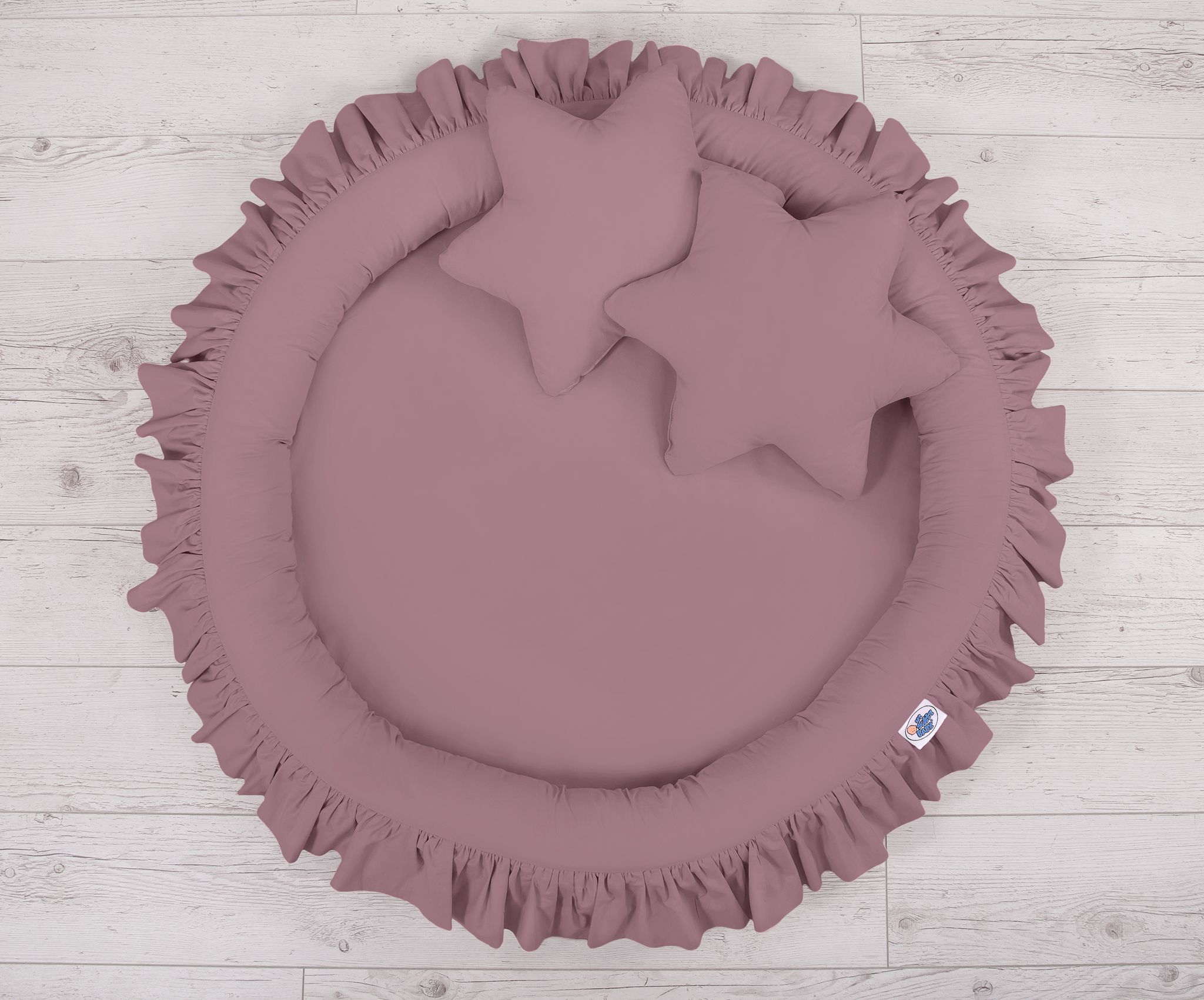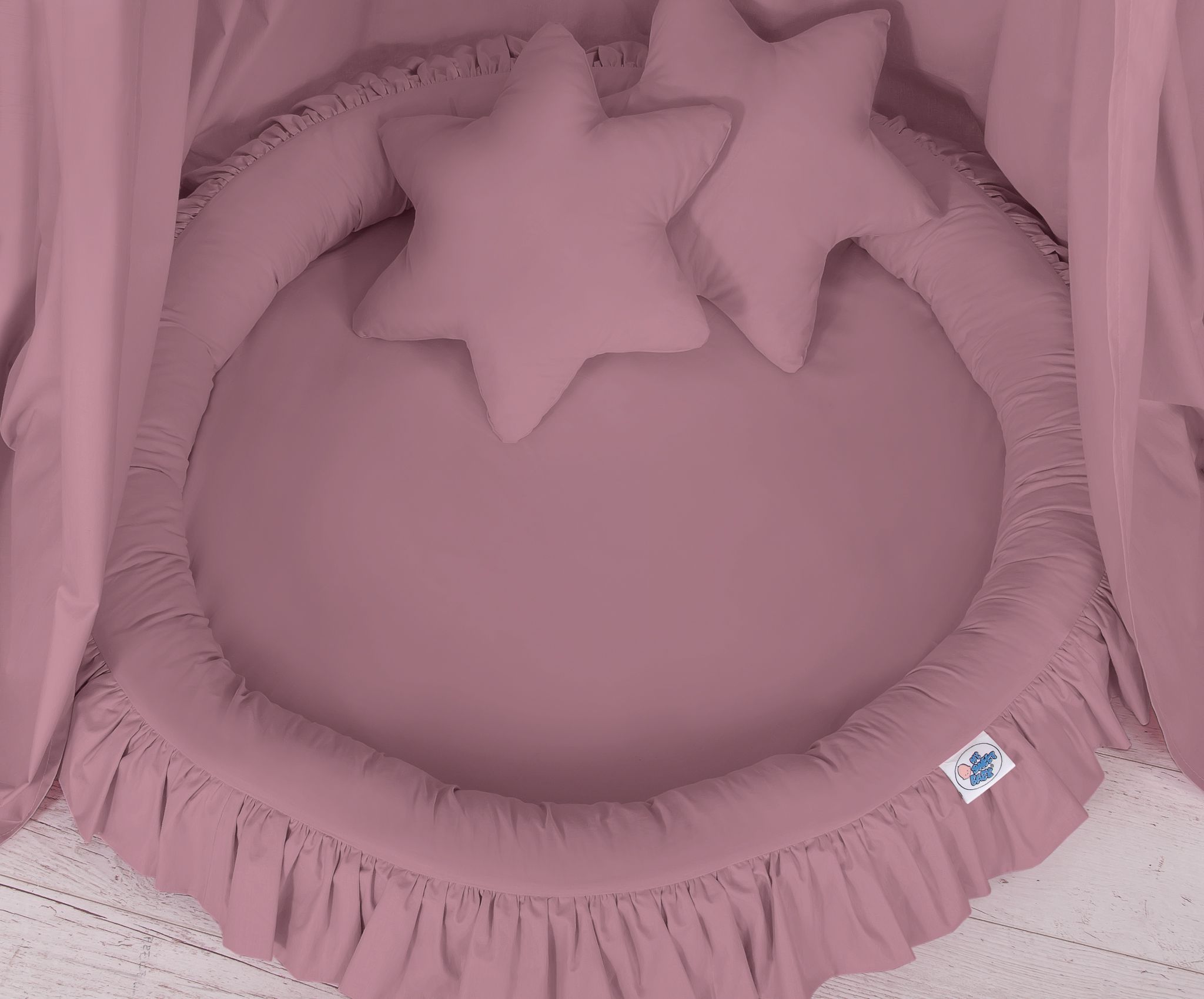 An effective long hanging canopy. A beautiful element it the children’s room. It can be used as a unique decoration of a baby cot, as well as it can create a wonderful  place to play. Hanging over the cot protect the canopy against too much light and noise creating a cozy  and safe place to rest inside the cot. The canopy can be easily mounted to the ceiling. The length of 260 cm allows to arrange the ends on the floor. This creates a perfect hiding place and playground for older children. The canopy is made of Okotex certificated, 100% cotton fabric. On the sides there are practical ribbons for tying the canopy and create a beautiful tent. The rim on the top can be removed. The fabric is washable by 30 Degrees. Combined with lovely nest with a flounce it will become a perfect place for fun. The soft edges provide safety for the babies. The edge is filled with approved, non-allergenic filling: Eco –Fillball fibers. They are soft, resilience and they assure the proper air circulation. The bottom of the baby nest with flounce is made of a modern, anti-allergenic, attested material. The bottom inlay can be removed and the cover can be washed at 30 degrees.