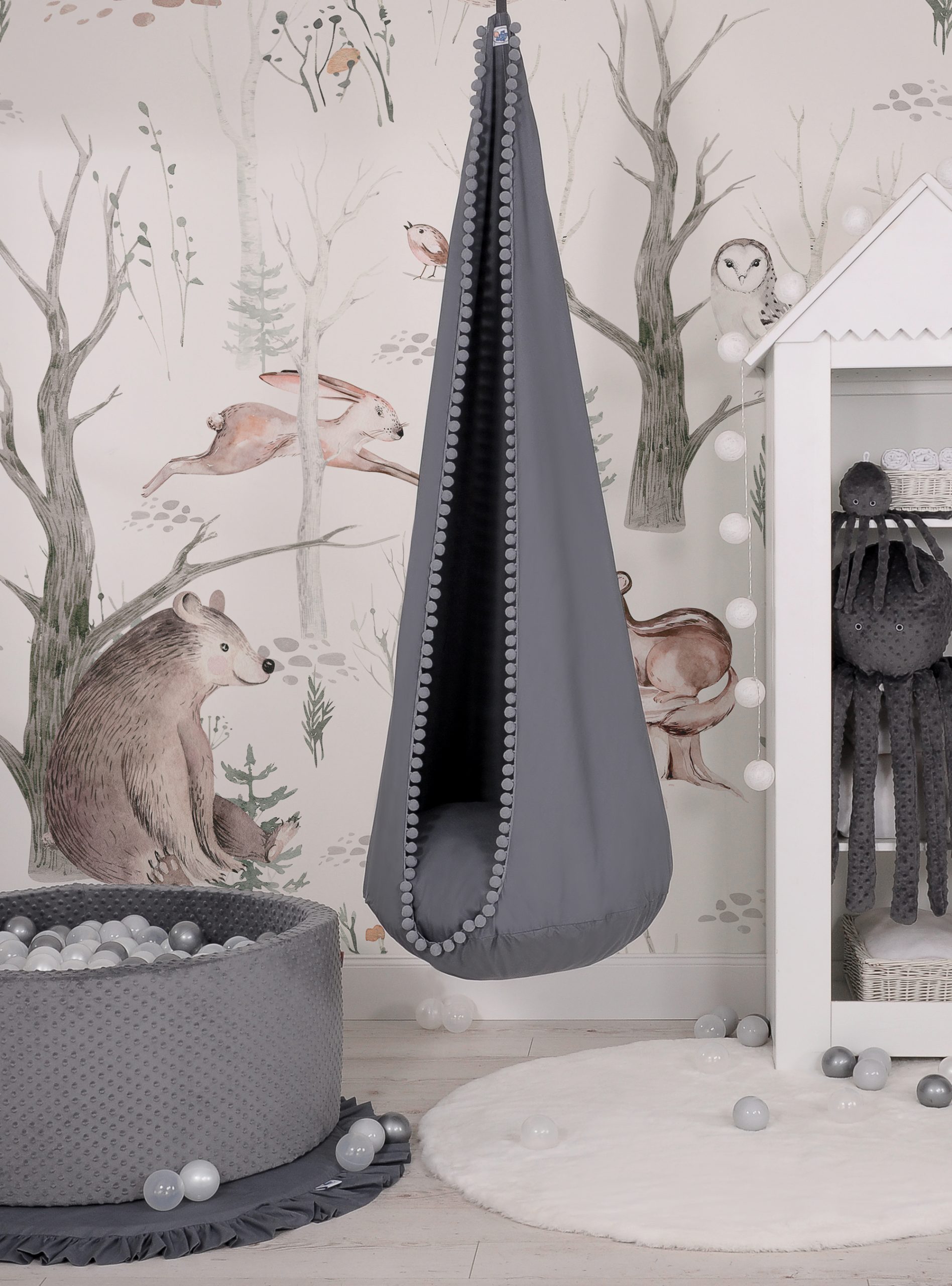 The swing has been made of high quality cotton. Two layers of fabric increase the stability and safety of the cocoon, strong straps strengthen the swing and careful handwork guarantees the highest quality. Cocoon decorated with decorative pompoms. Comes with a comfortable double sided cushion, removable for washing. Outer cover fastened with a covered zipper, easy to take off.