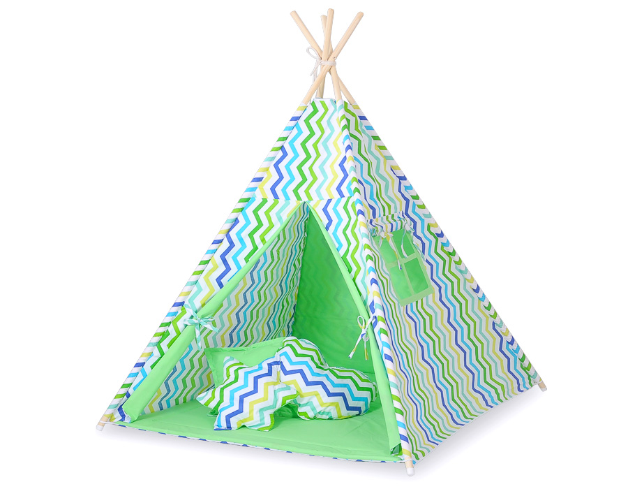 Teepee tent for kids + decorative feathers – Chevron green-blue