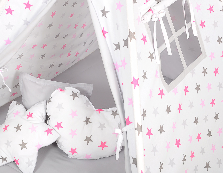 Teepee tent for kids + decorative feathers – Grey-pink stars/grey