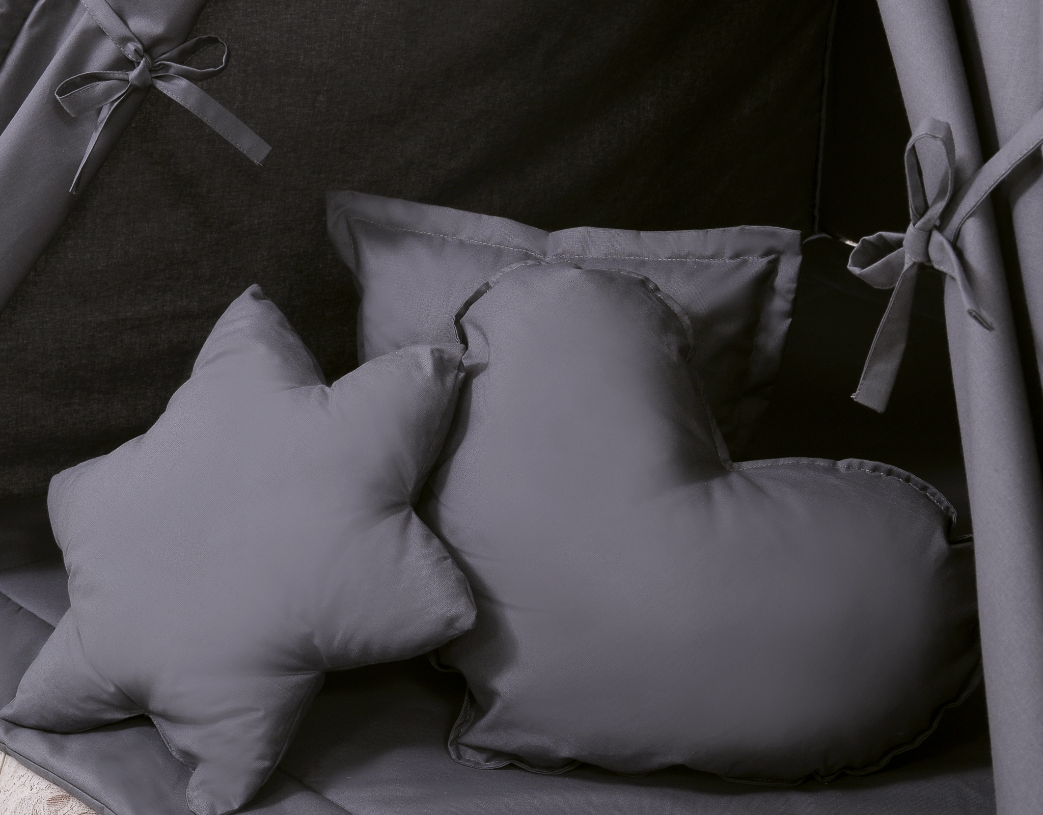 Includes a set of 3 pillows colour-coordinated with the tent in three different shapes: heart, star and square. Made from the highest quality certified 100% cotton, filled with special certified fibre – ECO FILLBALL.