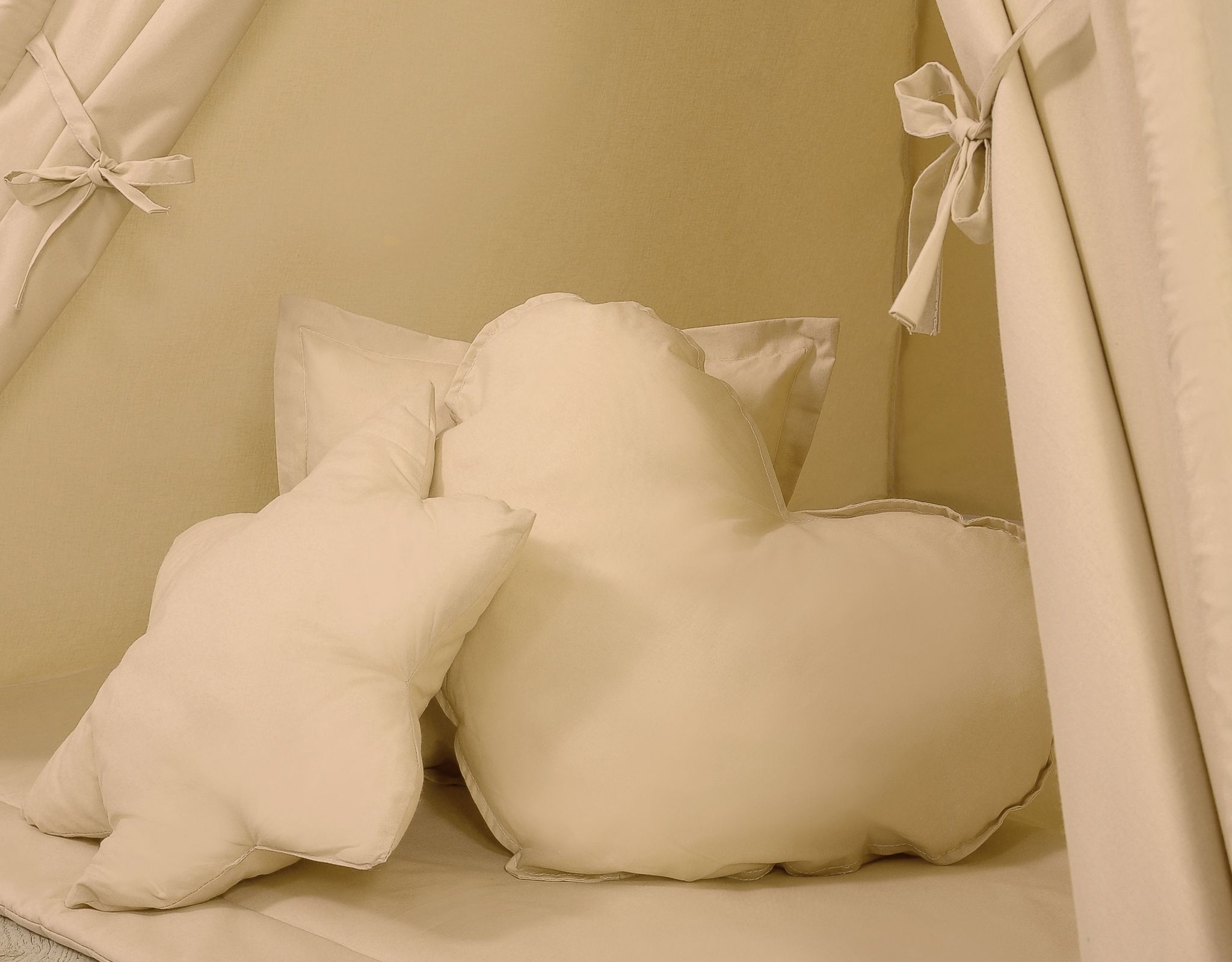Includes a set of 3 pillows colour-coordinated with the tent in three different shapes: heart, star and square. Made from the highest quality certified 100% cotton, filled with special certified fibre – ECO FILLBALL.