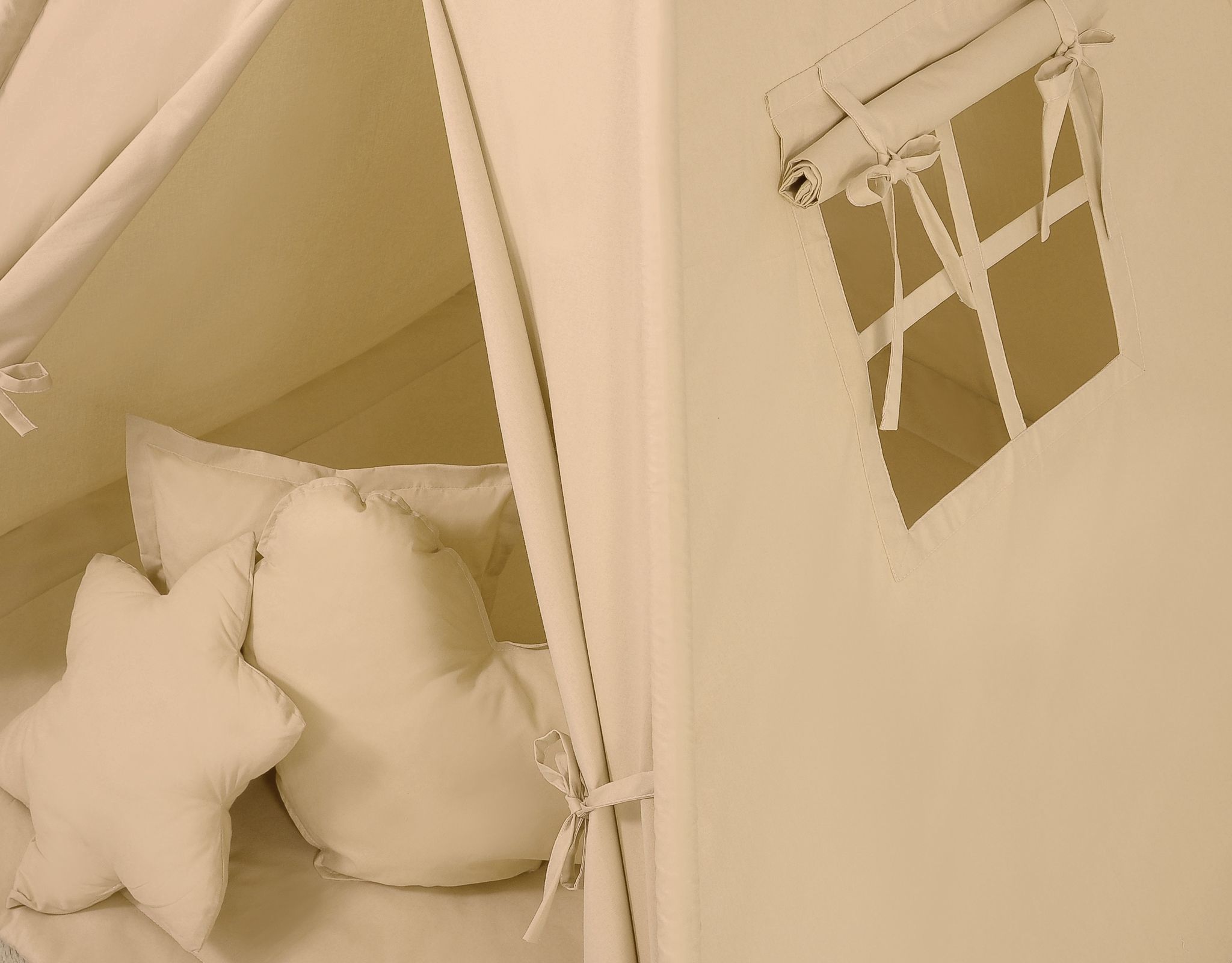 Thanks to its special design, the tent folds up easily and is very lightweight, making it easy to carry and set up anywhere. It has been made with attention to every detail so that it is safe and stable during play. The poles that build the tepee have been hidden in special tunnels – they are tied together at the top with a fastening string and finished with a special plastic cap at the bottom. The total height to which the tent unfolds is 150cm. The diameter of the lower part of the Tipi is approx. 130cm. The tent cover is removable and machine washable. There is a window with a curtain in the side wall of the tent, and the entrance to the tent has special ties that can be tied so that the child has a free passage into the tent and out. Once the curtains at the entrance have been lowered, the tent can provide an ideal hiding place during playtime.