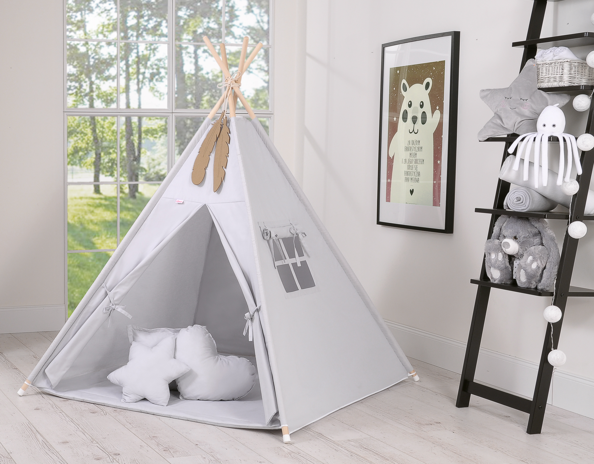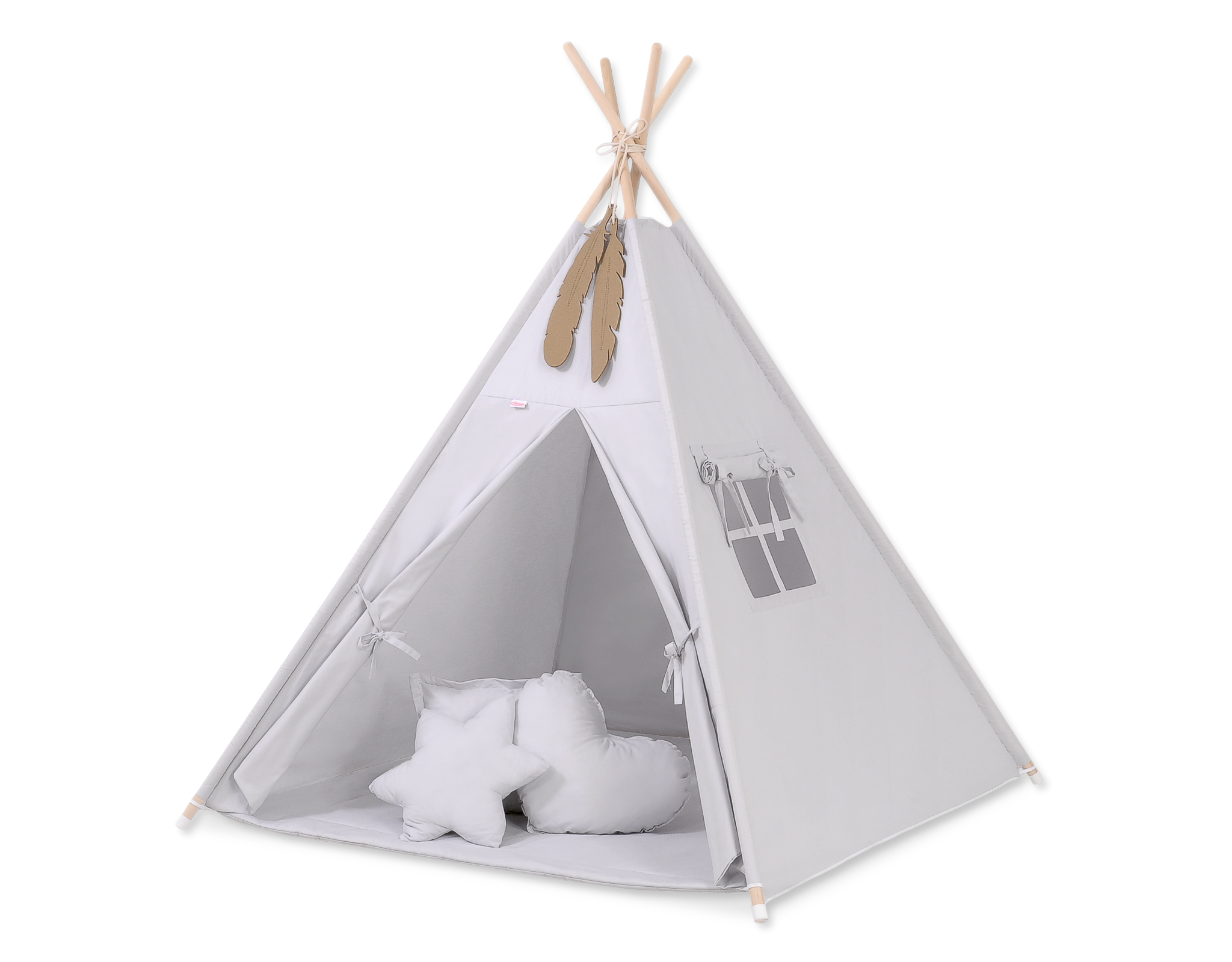 Teepee tent for kids + playmat + pillows + decorative feathers – gray