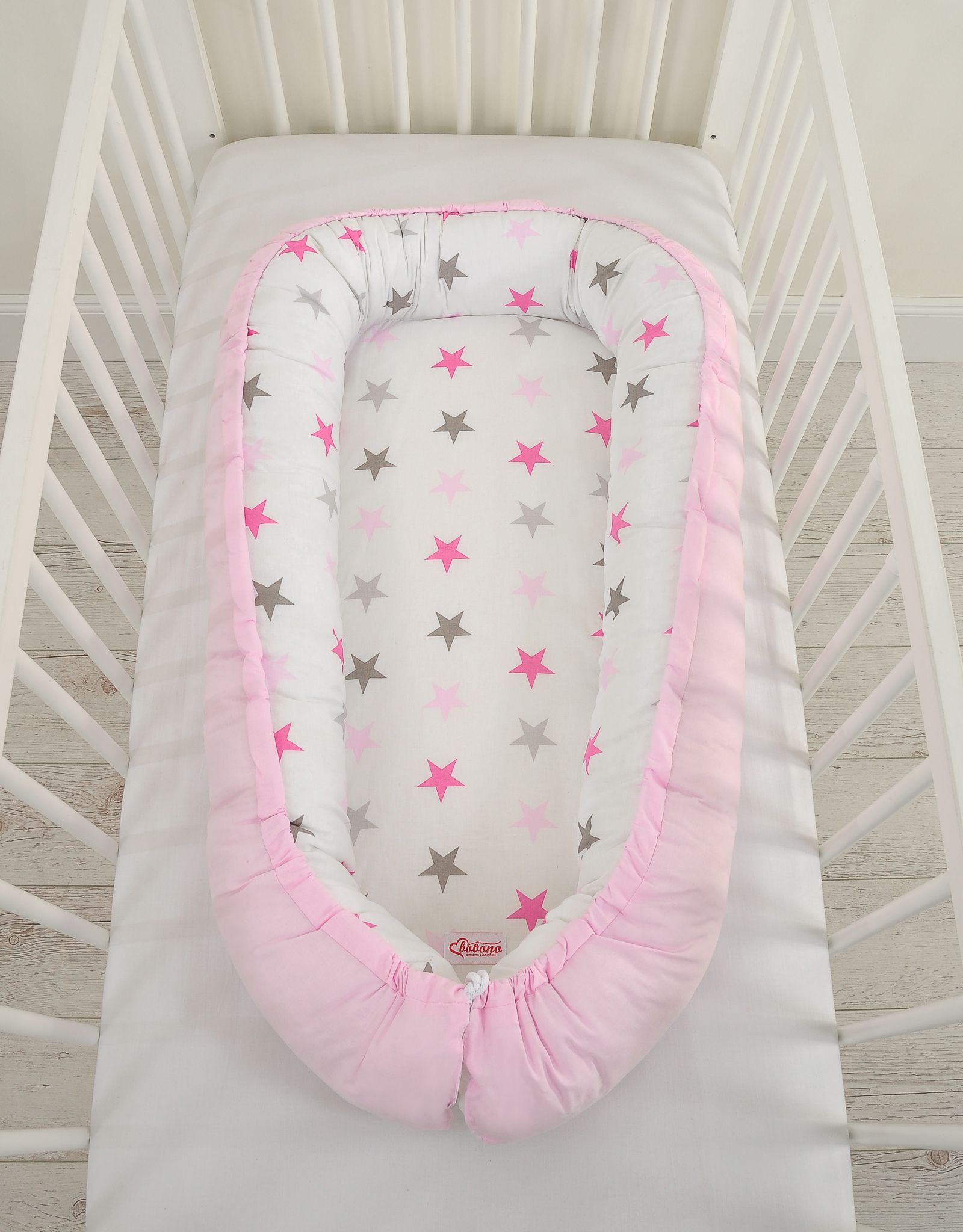Baby nest double-sided Premium Cocoon for infants BOBONO- gray-pink stars/ gray