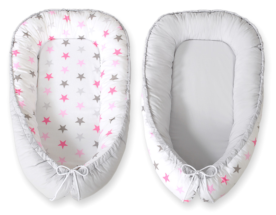 Baby nest double-sided Premium Cocoon for infants BOBONO- stars pink-grey/grey