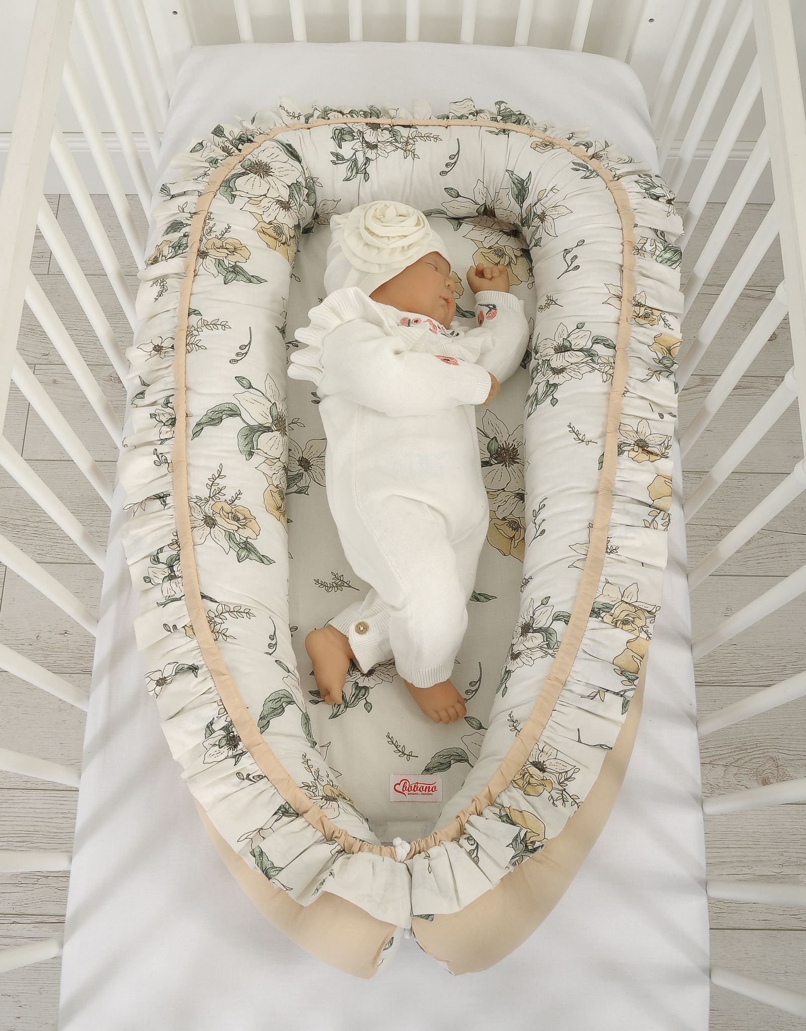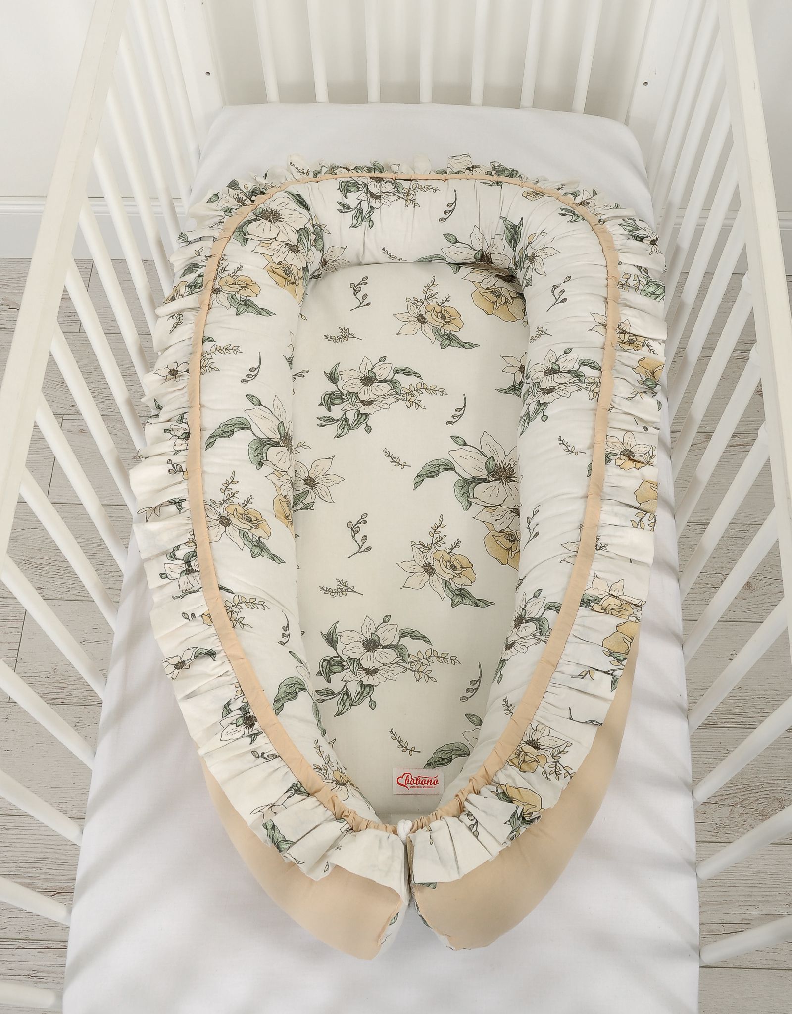 Baby nest Premium Cocoon for infants with a ruffle – Clematis on beige