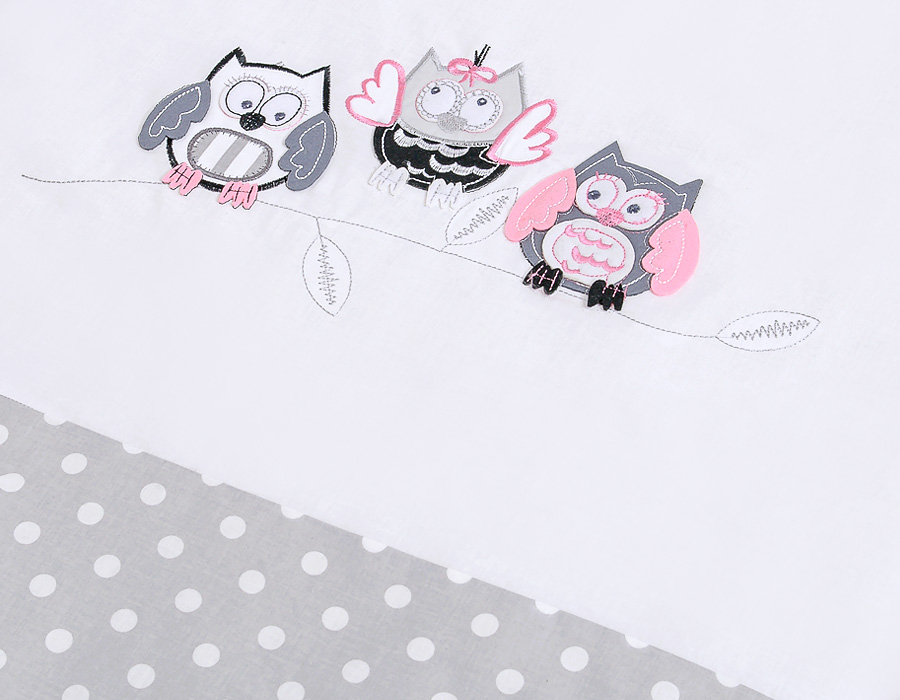 Baby bedding set 120×90 cm with bumper 3-pcs Grey Owls with grey and pink embroidery