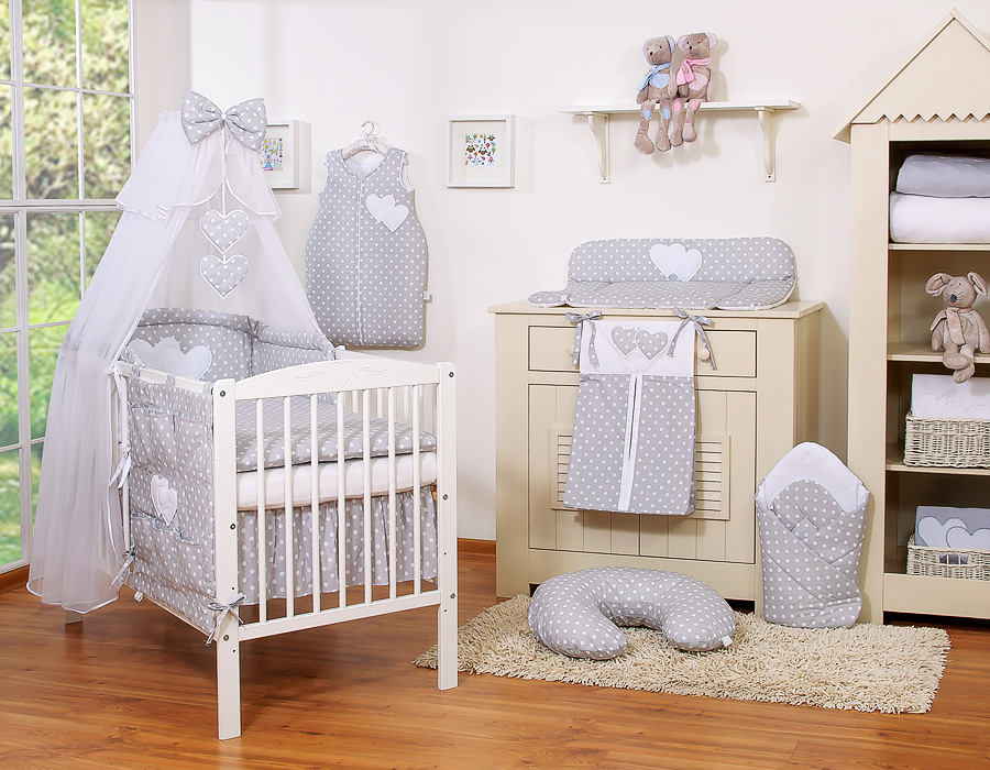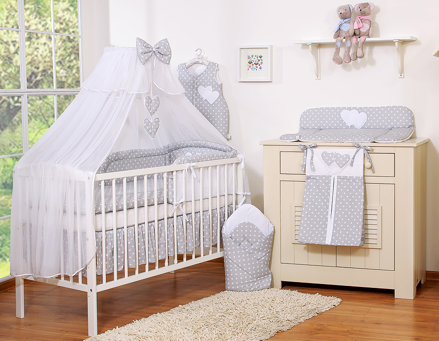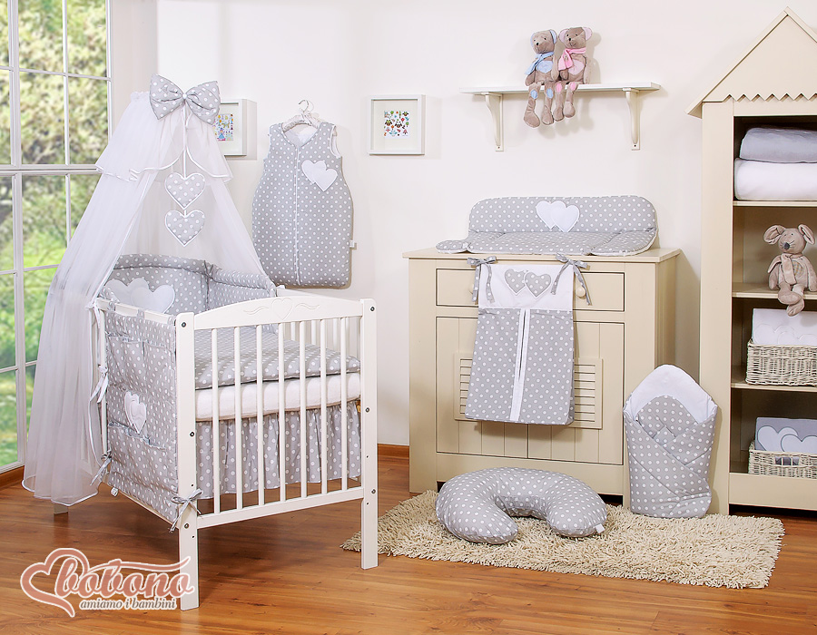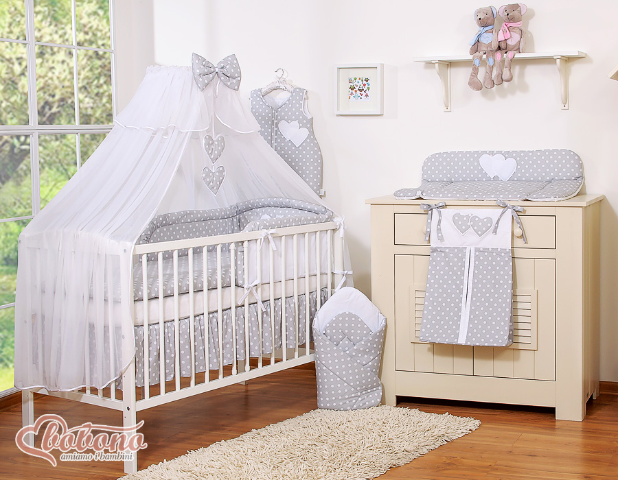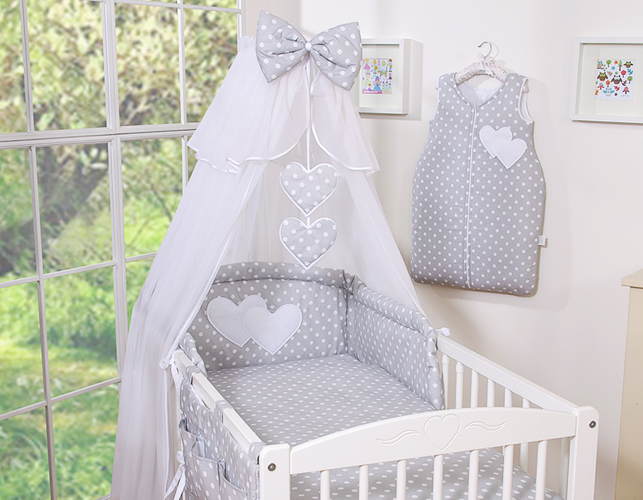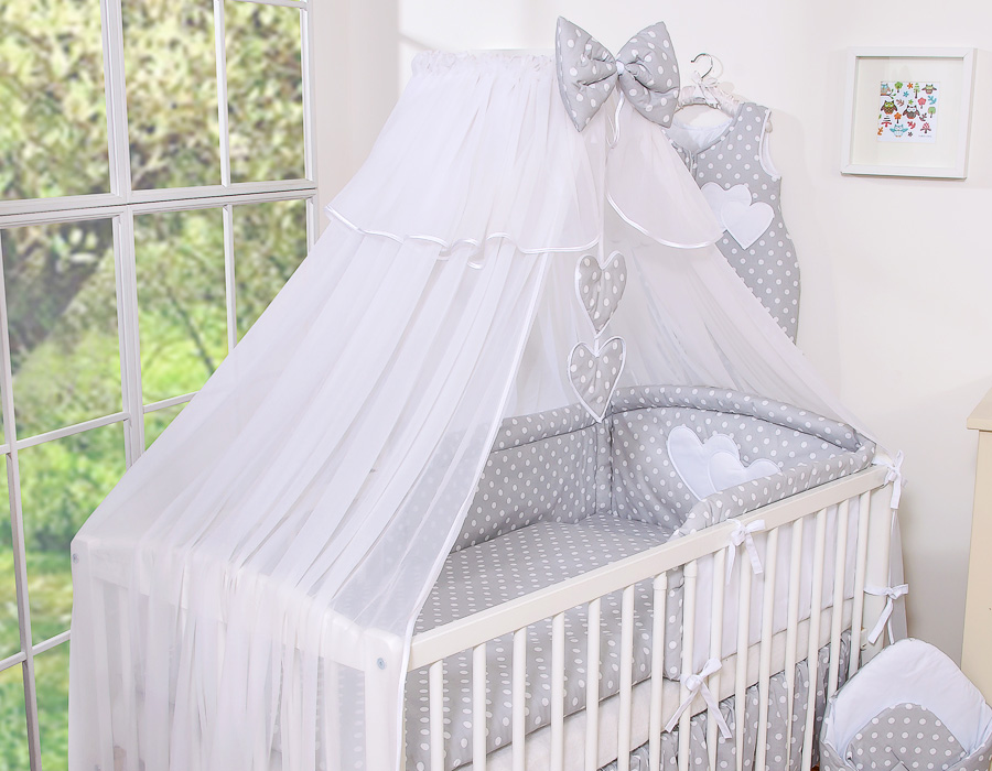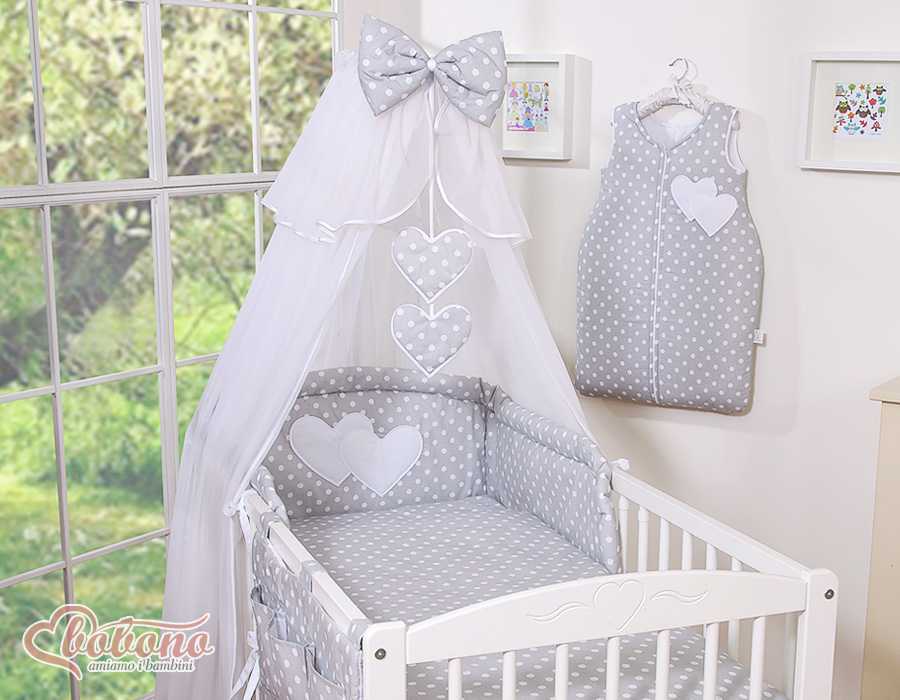 Bedding set 5-pcs with mosquito-net- Hanging Hearts white dots on grey