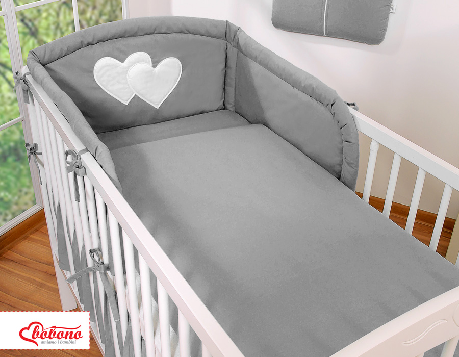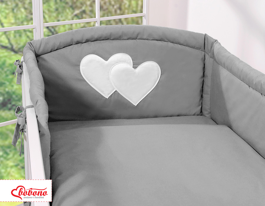 Dimensions: length 188 cm, height 35 cm. Specially designed with additional stitching. Perfectly fit for both size of cots: 60x120cm and 70x140cm. High headboard slightly rounded with decorative hearts, beautifully trimmed with satin piping. Specially trimmed, reinforced and thickened upper edge for greater softness and greater security in the cot.
