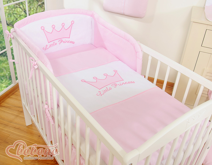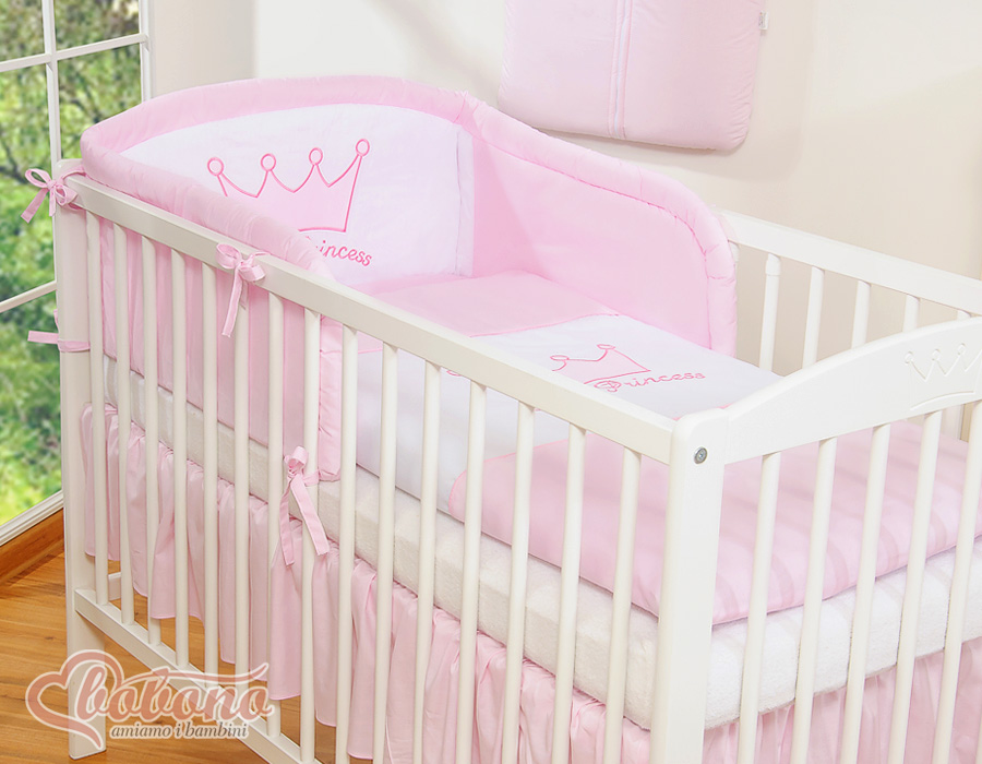 Dimensions: length 188 cm, height 35 cm. Specially designed with additional stitching. Perfectly fit for both size of cots: 60x120cm and 70x140cm. High headboard slightly rounded with decorative embroidery with crown. Specially trimmed, reinforced and thickened upper edge for greater softness and greater security in the cot. Bumper is filled with a special non-allergic and breathable Filling (certified OKOTEX).