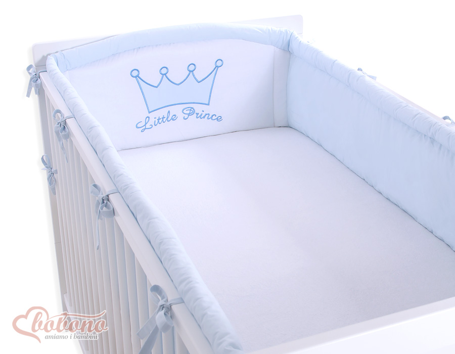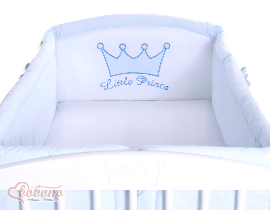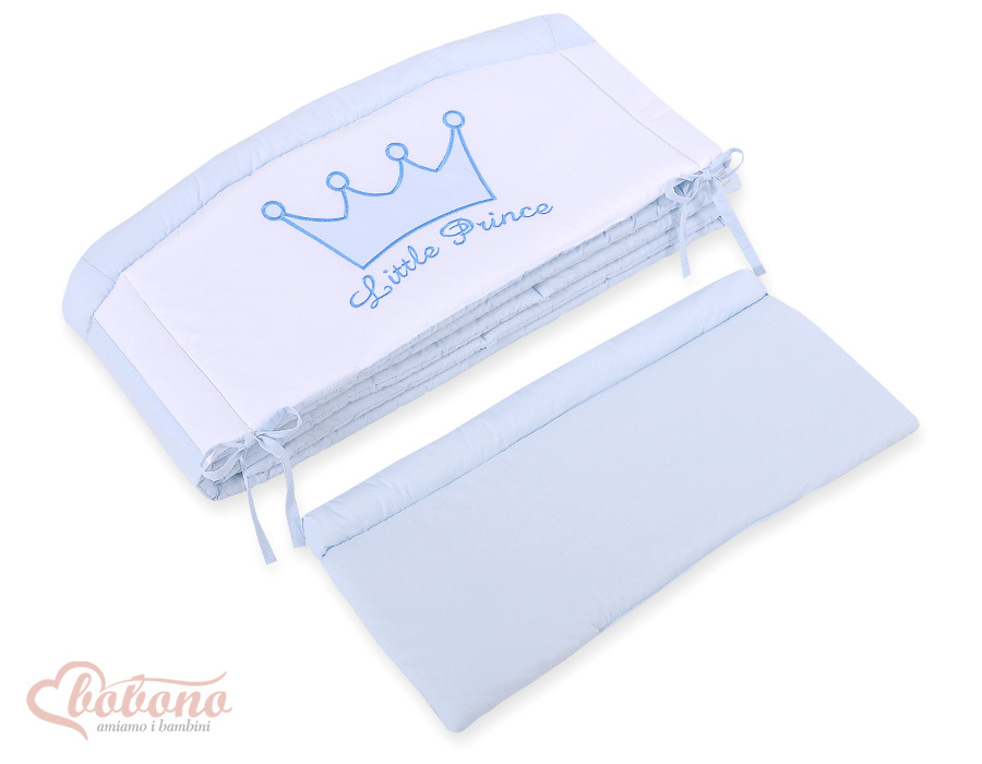 Dimensions: L-360cm, H- 35cm/ L-60cm, H-28cm. Specially designed, with additional stitching. Perfectly fit for both size of cots: 60x120cm and 70x140cm. High headboard slightly rounded with decorative embroidery with crown. Specially trimmed, reinforced and thickened upper edge for greater softness and greater security in the cot.