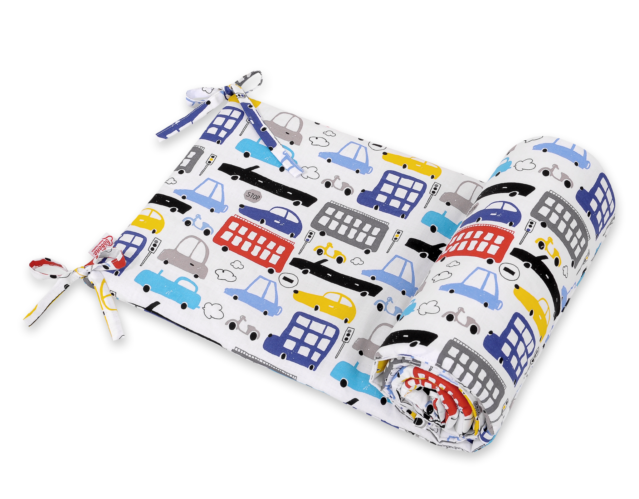 Specially constructed and with additional stitching, so that it perfectly fits both the 120×60 cm cot and the larger 140×70 cm baby cot. The bumper is filled with a layer of elastic anti-allergic silicone nonwoven fabric, thanks to which it fits nicely on the bed. The nonwoven fabric is Ökotex certified. The cover of the bumper is made of the highest quality cotton, which does not lose its properties even after many washes. Cotton strong straps allow for easy and solid attachment of the bumper.