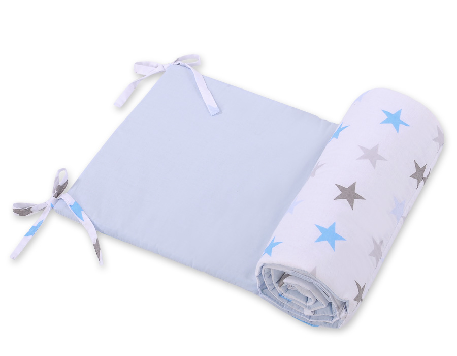 Specially constructed and with additional stitching, so that it perfectly fits both the 120×60 cm cot and the larger 140×70 cm baby cot. The bumper is filled with a layer of elastic anti-allergic silicone nonwoven fabric, thanks to which it fits nicely on the bed. The nonwoven fabric is Ökotex certified. The cover of the bumper is made of the highest quality cotton, which does not lose its properties even after many washes. Cotton strong straps allow for easy and solid attachment of the bumper.