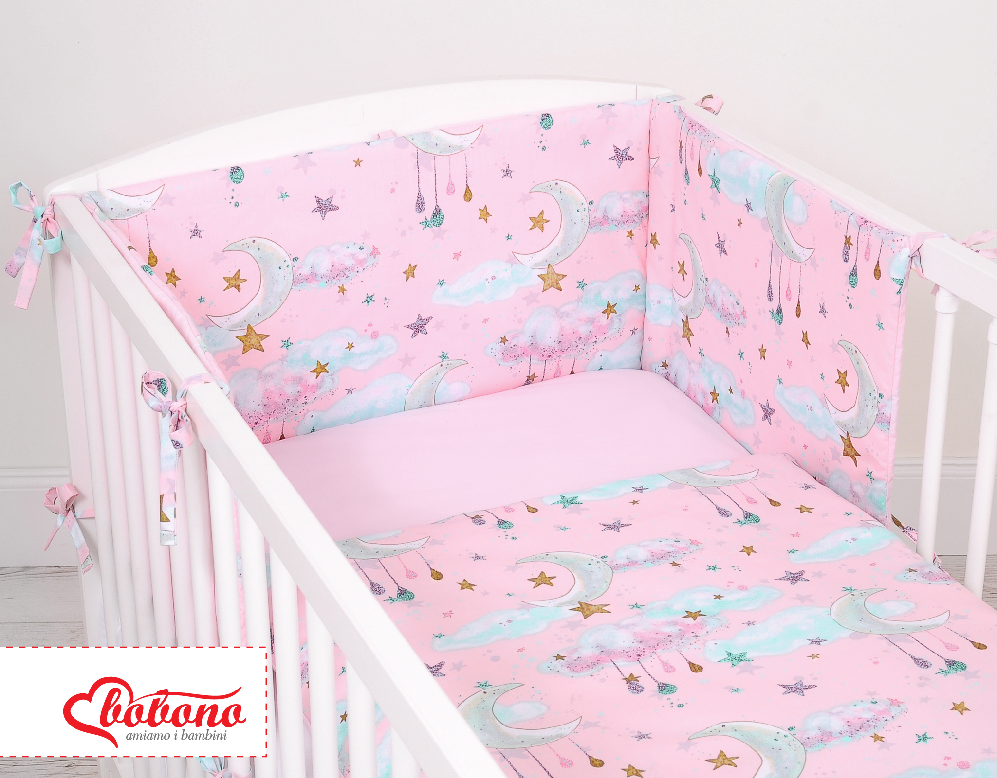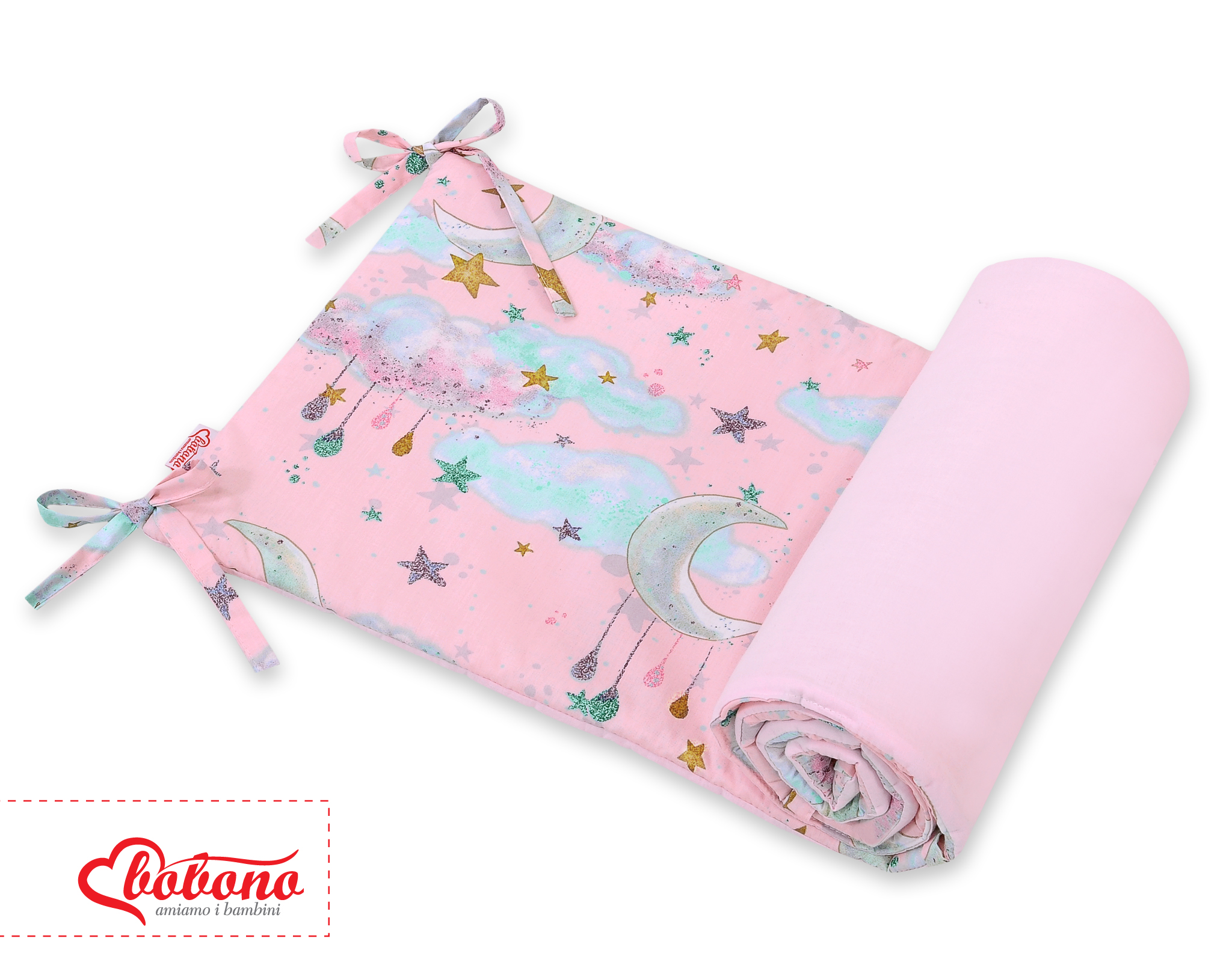 Specially constructed and with additional stitching, so that it perfectly fits both the 120×60 cm cot and the larger 140×70 cm baby cot. The bumper is filled with a layer of elastic anti-allergic silicone nonwoven fabric, thanks to which it fits nicely on the bed. The nonwoven fabric is Ökotex certified. The cover of the bumper is made of the highest quality cotton, which does not lose its properties even after many washes. The fabric has a delicate gilding, which gives it even more fairytale character. Cotton strong straps allow for easy and solid attachment of the bumper.