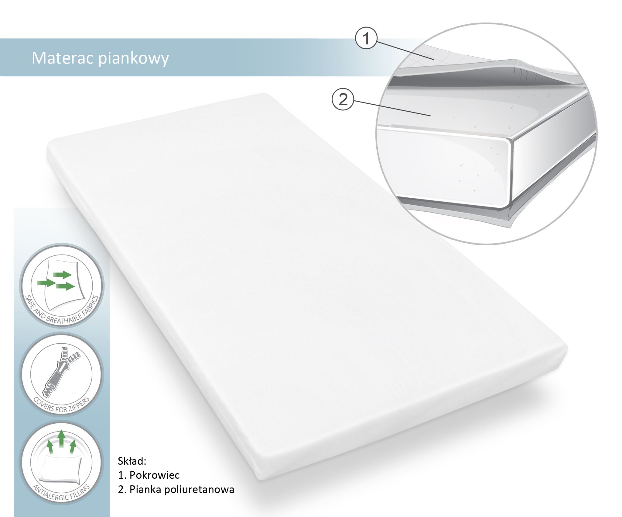 The high-quality baby foam mattress fits all baby beds with the dimensions 60 x 120cm. The mattress is made of thick resilient PU foam with the right softness for optimal resilience. Guarantees comfort, adapts to the weight of a small child. A great solution for the beginning, for the youngest.