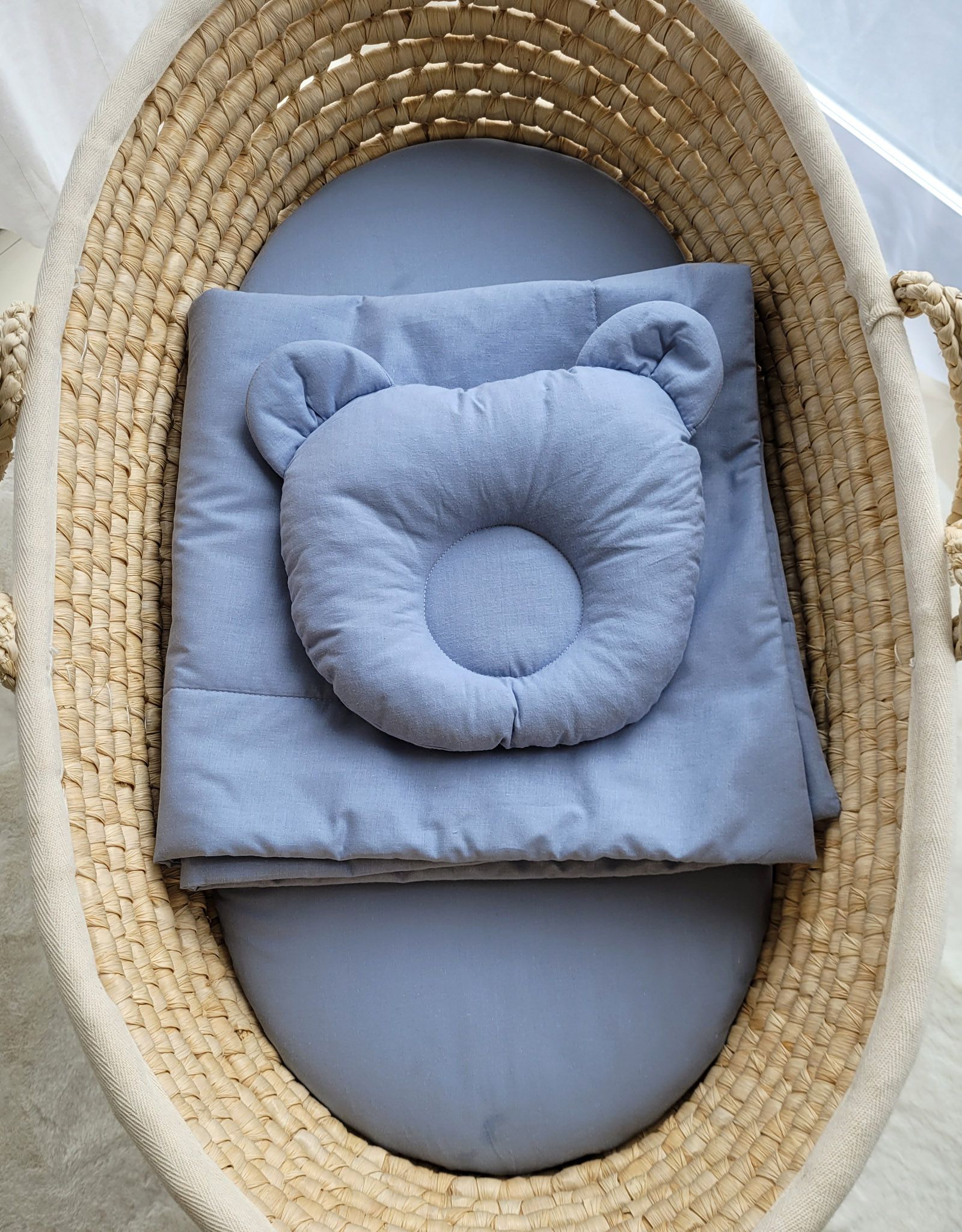 Baby set – bedding with filling and Teddy bear shaped pillow. Made of the highest quality Okotex-certified cotton fabric. Filling – also Okotex-certified, without optical brighteners.