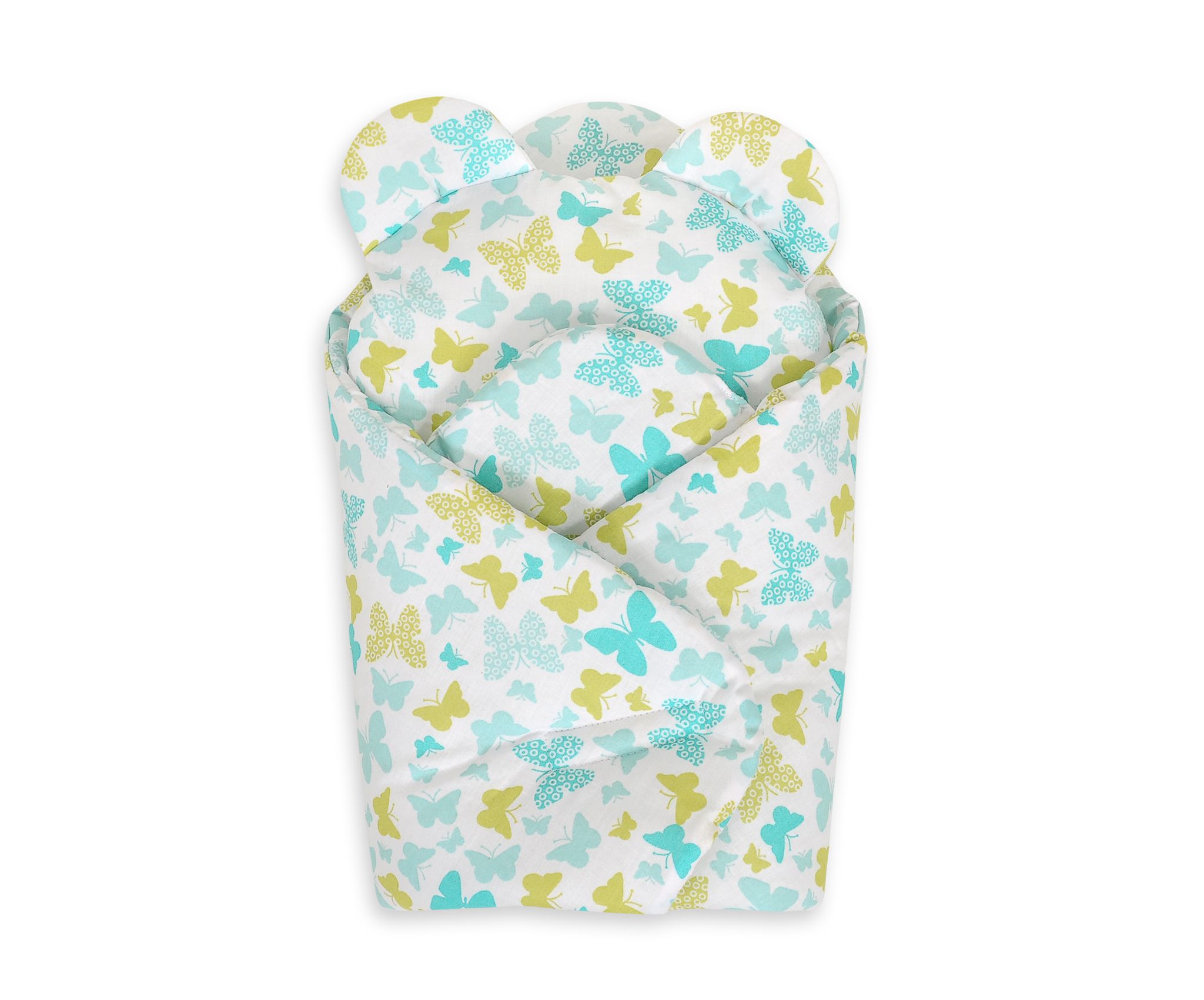 100% Polish handmade product. Made of durable 100% certified cotton, rounded edges, extra stitching for extra durability.  The swaddle blanket is closed at the front.