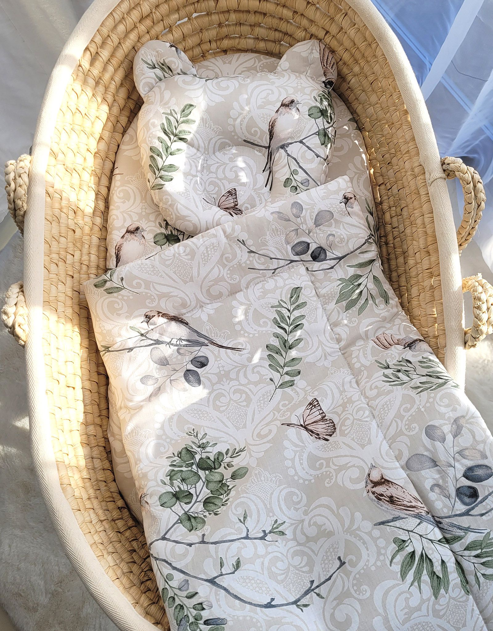 Baby bedding for pram gondola, Moses basket or cot. Made of durable 100% certified cotton. It is nice and pleasant to the touch. Does not irritate your baby’s delicate skin.