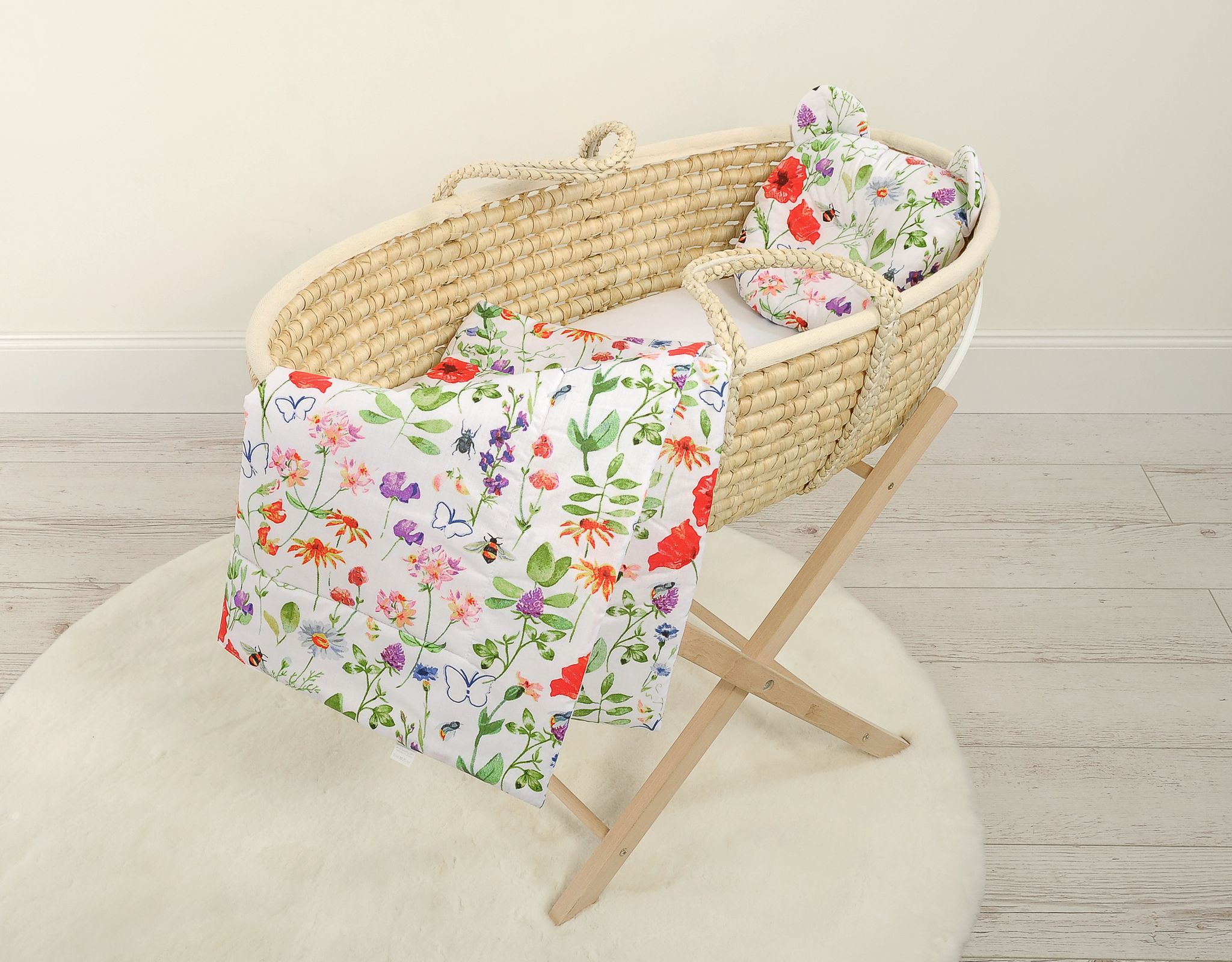 Baby bedding for pram gondola, Moses basket or cot. Made of durable 100% certified cotton. It is nice and pleasant to the touch. Does not irritate your baby’s delicate skin.