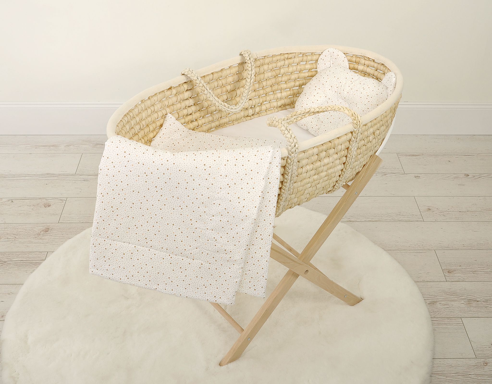 Baby bedding for pram gondola, Moses basket or cot. Made of durable 100% certified cotton. It is nice and pleasant to the touch. Does not irritate your baby’s delicate skin.
