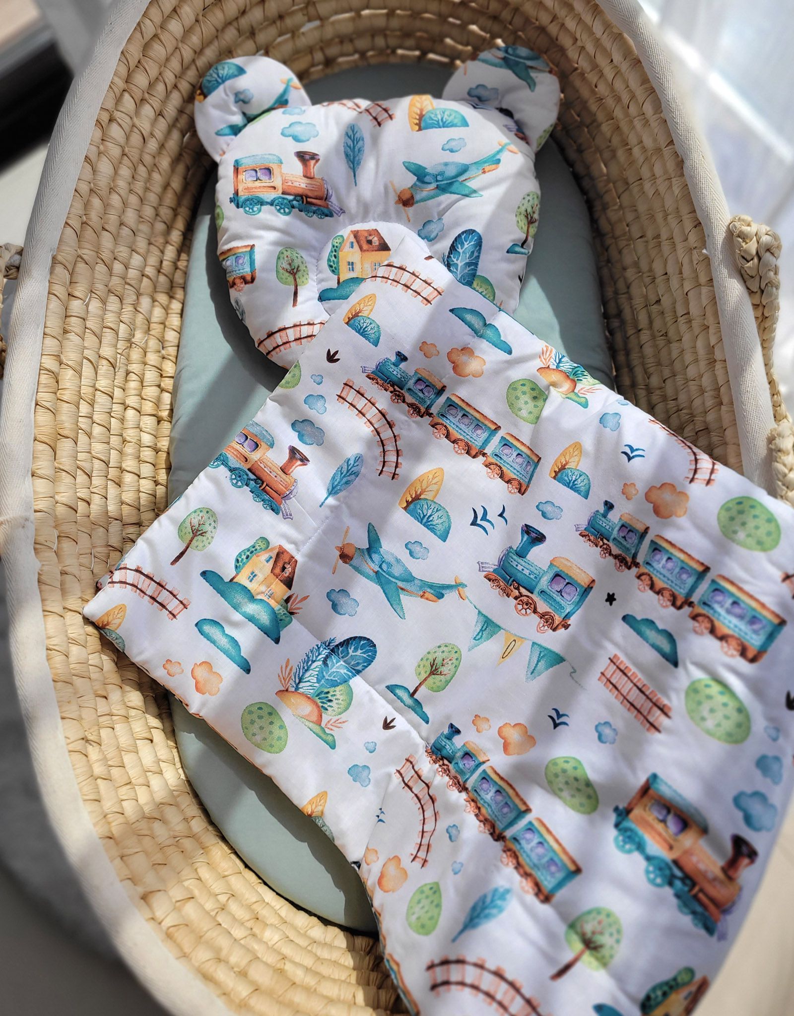 Baby set – bedding with filling and Teddy bear shaped pillow. Made of the highest quality Okotex-certified cotton fabric. Filling – also Okotex-certified, without optical brighteners.