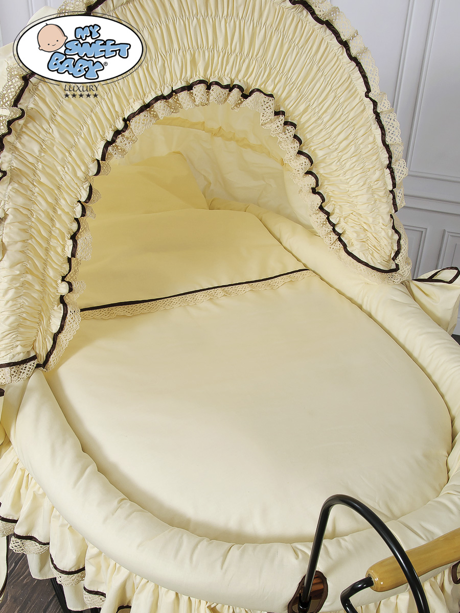 → basket cover with sewn-in soft filling, hood cover, pillow and cover (filling: outer fabric 100% Cotton, padding: 100% Polyester) duvet cover and quilt cover, all from 100 % cotton fabrics