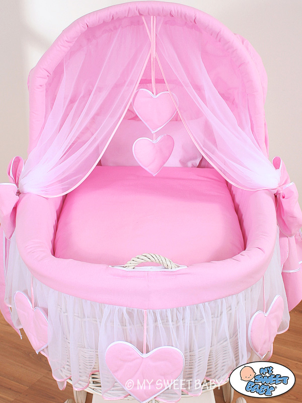 The set includes complete bedding and hood cover as shown in the picture. · The biggest bassinet on the market with total sizing of L 98 cm, B 65 cm, H 130 cm. The biggest lying space: 80×45 cm allows to use the crib longer. Suitable from birth to 9 months approx. · Manually caned basket made of healthy, natural wicker. · The chassis made of real wood, very stable! Much higher than in other producers – 50 cm high. It brings comfort as bending down for the baby is not necessary. · Big wheels made of real wood (with the diameter of 30 cm) turn lightly and quietly. Each wheel has white rubber tyres that leave no marks on the floor. · All materials, from the wood for the chassis, through the wicker for the basket, to materials and the trim stuffing are precisely inspected and finished in detail. · The handle at the front of the bassinet allows to change its position easily. · Special hood mechanism allows to place the hood in every position. The mechanism is fixed to the basket, nevertheless, its elements may be easily disassembled to be take off the trim for washing. · Each basket is lined with a thick layer of fleece trimmed with cotton. It makes the basket a soft and comfortable nest your baby may sleep in. · A cotton pillow (35x37cm) and cover (78x78cm) are filled with special anti-allergic stuffing, very light and warm. The bed – clothing is 100% cotton. All elements may be mechanically washed. · The whole is easy – to –assemble, it’s enough to follow the assembly instruction. Just two moves and it’s ready! · Anti-allergic mattress, with a cover that may be taken off.