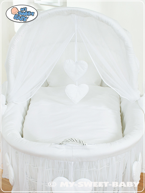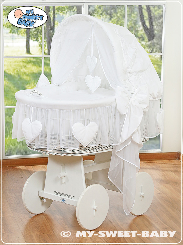 A beautiful basket. The biggest bassinet on the market. A white color of wicker and wood.