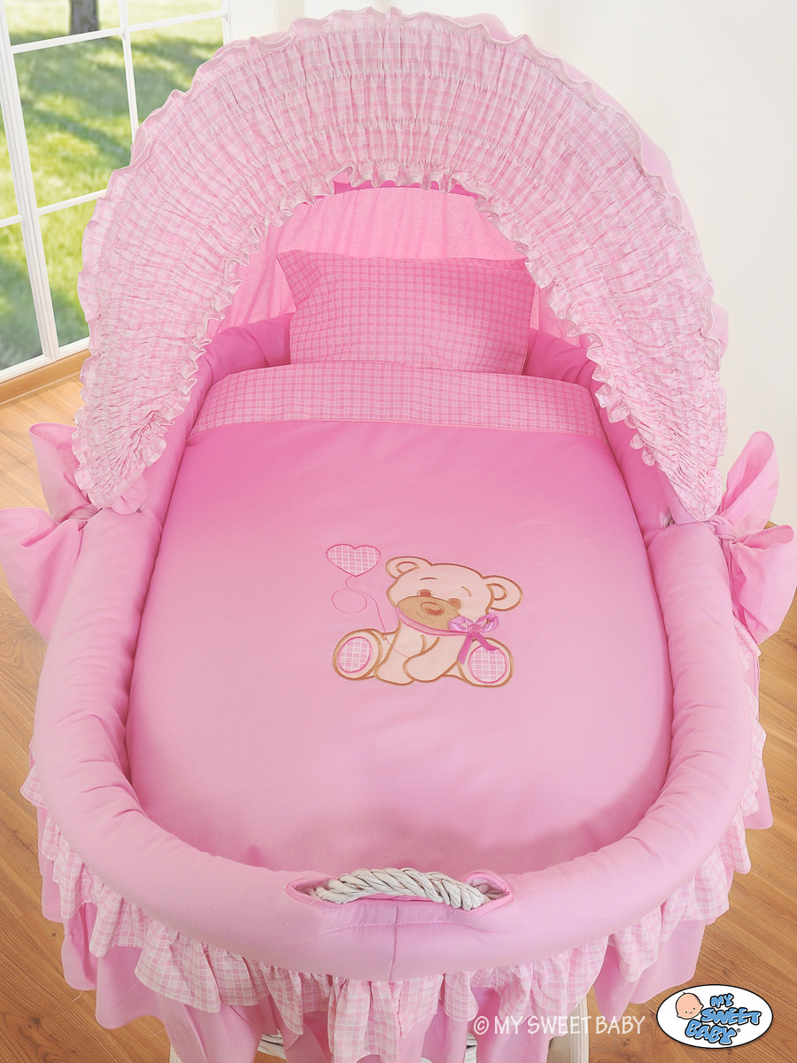 Moses Basket/Wicker crib with hood- Bear with bow pink