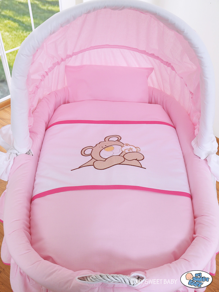 Moses Basket/Wicker crib with hood- Teddy Bear Barnaba pink