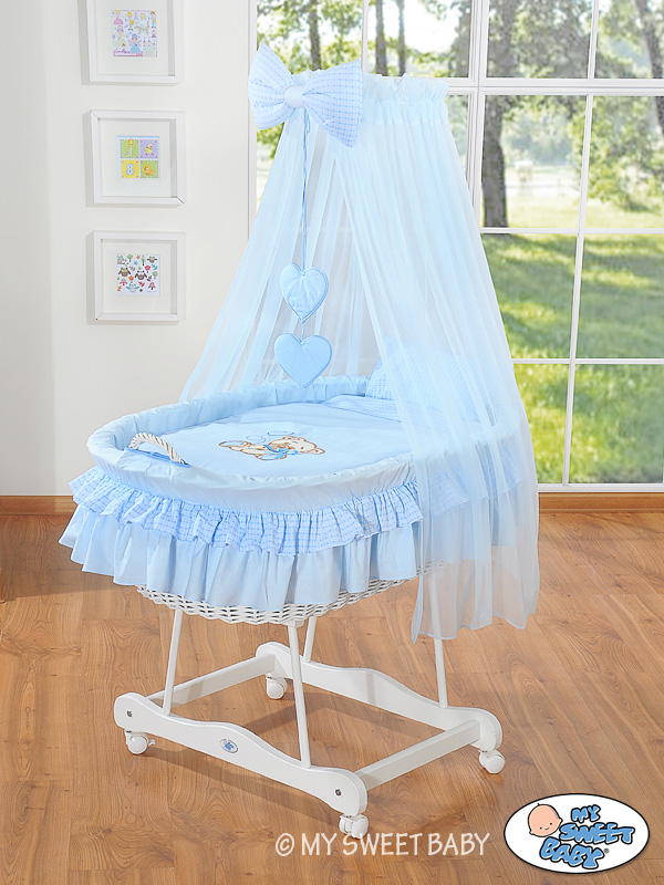 Moses Basket/Wicker drape crib- Bear with bow blue