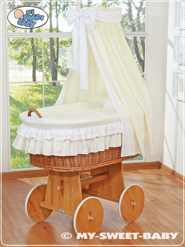 A beautiful basket. The biggest bassinet on the market. A natural color of wicker and wood.