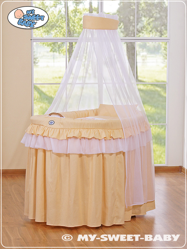 A beautiful basket. The biggest bassinet on the market.  A natural color of wicker and wood.